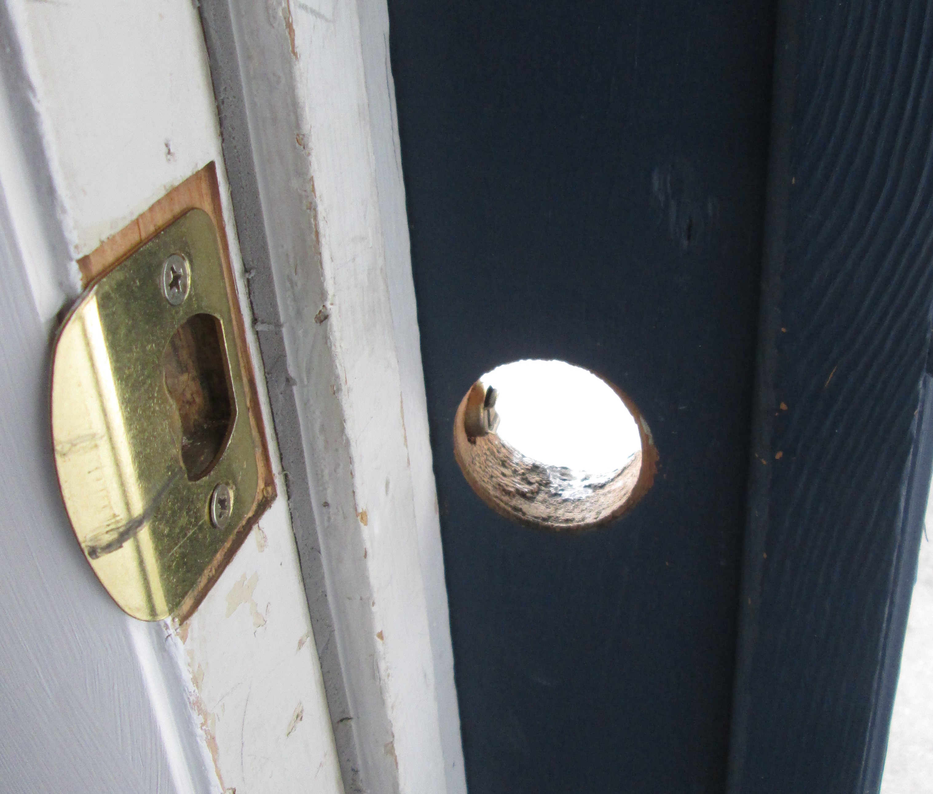 on the inside door, which didn’t need one, and the familiar gaping hole on the screen door.