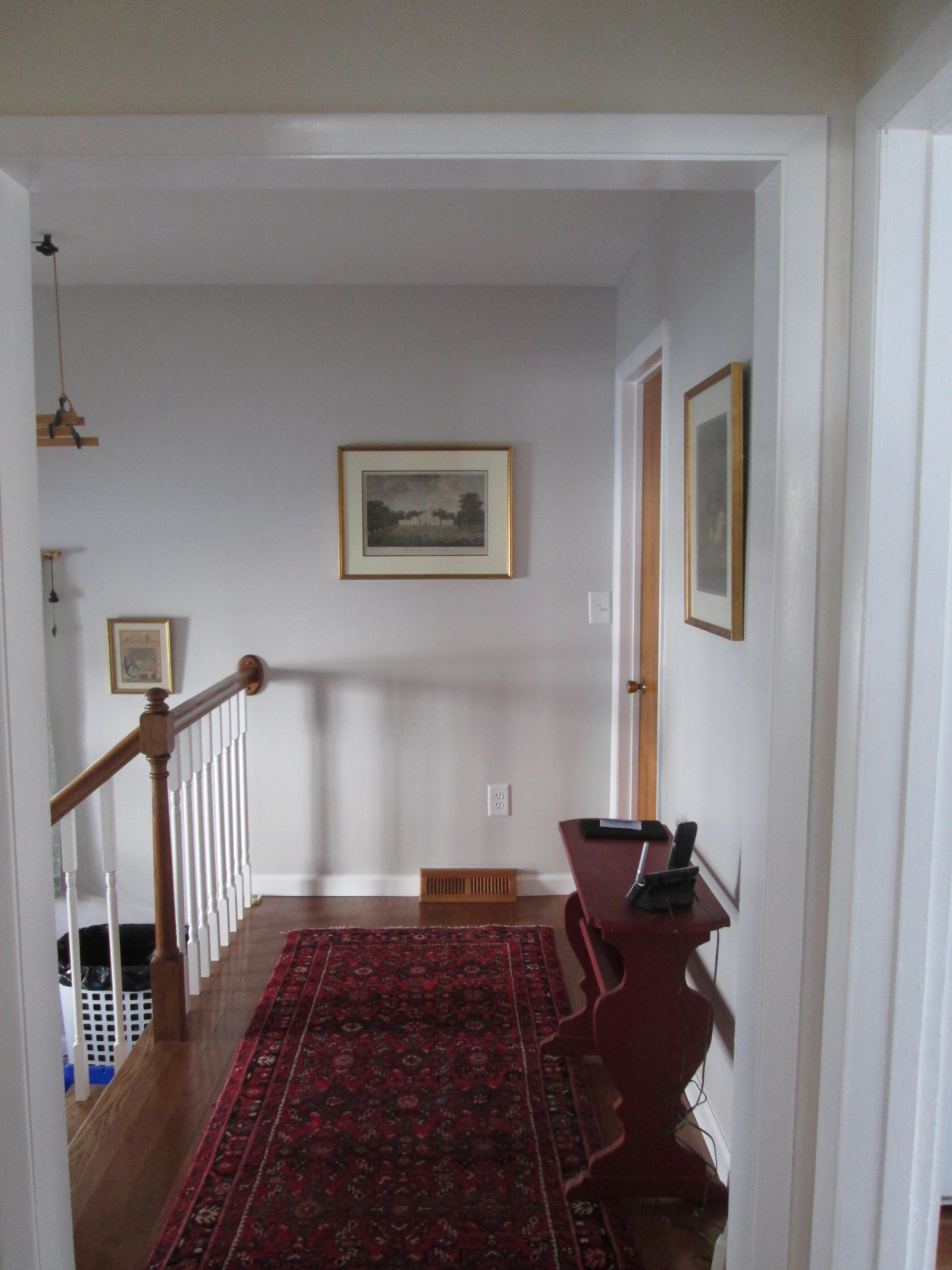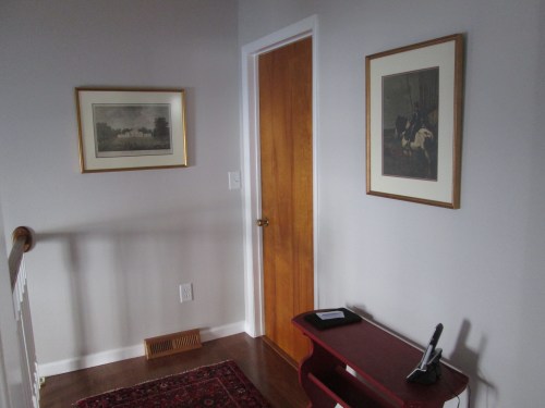 In the hallway, we’ve put the rug back down and the pictures up. We also added a little red table that we brought home from our cottage. It may not stay, but it’s nice to have somewhere to put the phone (yes, we still have a landline).
