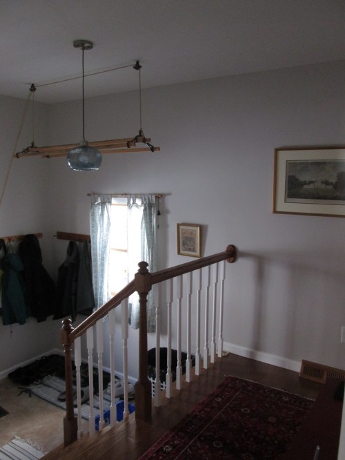 That funky structure hanging from the ceiling is our “Sheila Maid”, a wonderful drying rack that lowers via a cool pulley system. It was indispensable when our children were young, but we still find it useful for items can’t go in the dryer.
