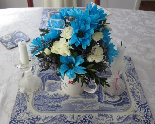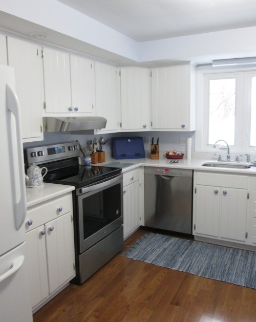 In case you wondered, our local home-store finished the kitchen project for us. They were incredibly nice, efficient, and quick. Obviously, I should have gone to them in the first place! They even sent us flowers — blue ones to match the decor!