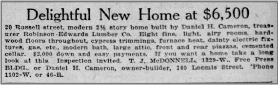 The ad appeared in the Burlington Free Press on October 20, 1922. One is immediately struck by the way house prices have skyrocketed over the nearly 100 years since then — yikes! Beyond that, I am mystified as to why my great grandfather built a house apparently in order to sell it. It is not larger than the one he lived in on Loomis street, and his own children were all gone by then anyway. I suppose it was a business venture. I wish I had a house with “dainty electric fixtures”, don’t you? If I am correct, 20 Russell st. should be the house on the left in this photo.