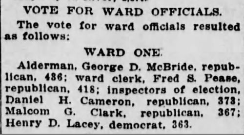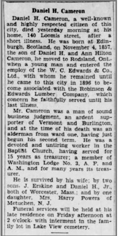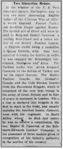 By the way, the medals article appeared in the Montpelier Morning Post of January, 1910, while the other two stories ran in the Burlington Free Press. The car-fire occurred in January, 1928 and the election in March, 1918. When Daniel died in May, 1929, his obituary appeared in the Burlington Free Press.