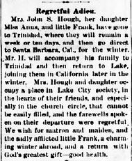 I am struck not only by the close-knit community of friends but by the ease and frequency with which the Houghs traveled back and forth from Colorado to Kansas and even farther afield, often in search of a healing climate. In 1782, for example, the Las Animas paper noted: