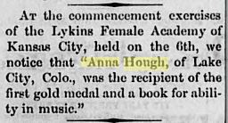 The family survived the terrible double-blow, and life eventually returned to normal. Anna Hough, our great-grandmother, graduated from school in 1878 with an award in music.