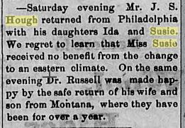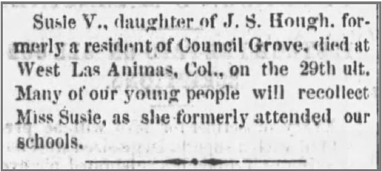 The obvious conclusion is that Susie had some chronic illness — perhaps tuberculosis — and her parents sent the girls back to John’s relatives in Philadelphia in hopes of finding a cure. Presumably, when her health deteriorated further, they brought her home. Susie died 10 days after her return. The paper in Council Grove, Kansas included this notice (dated 12/15/1875).