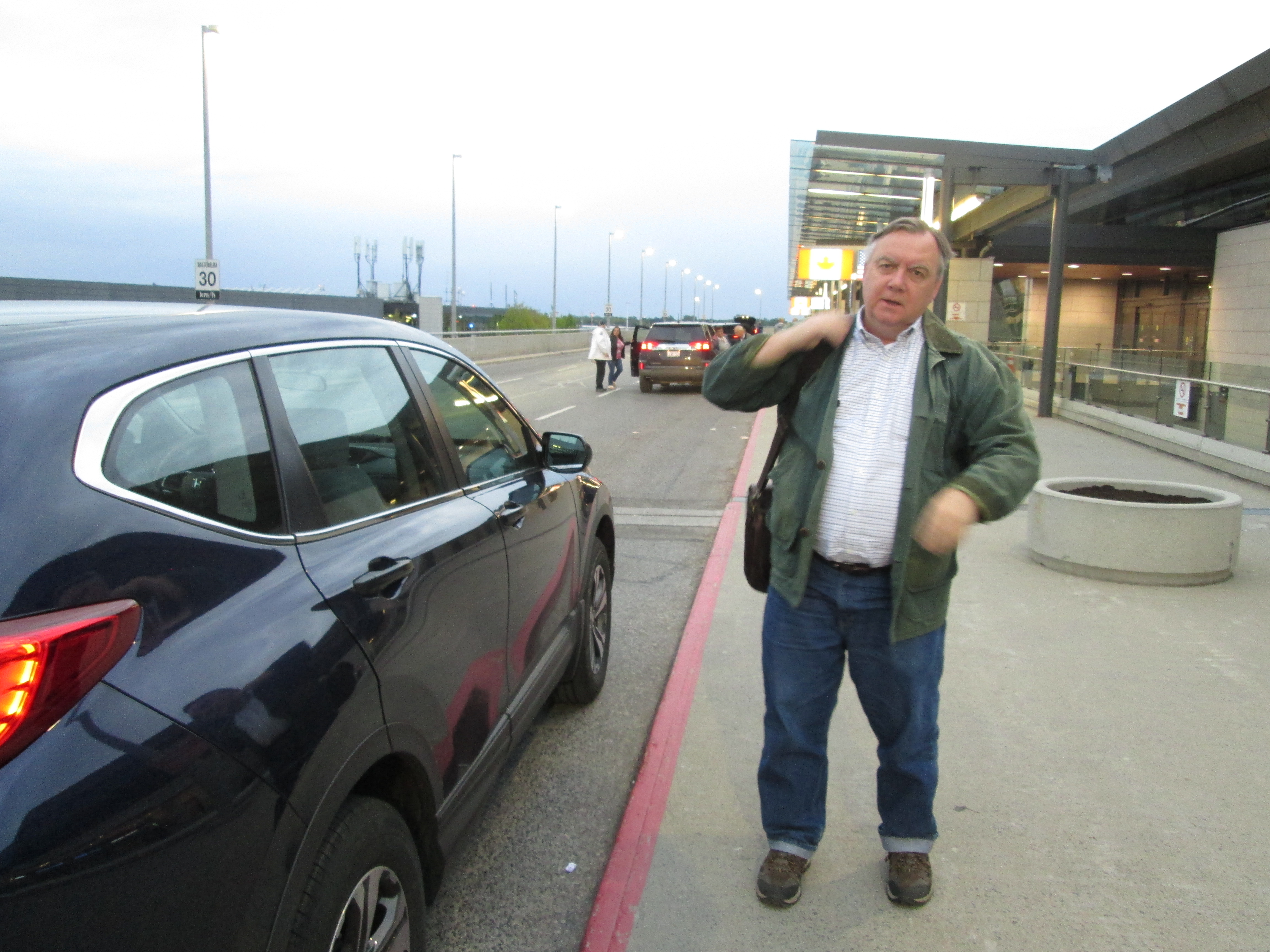 Having barely returned from the UK, my DH is now off to Vancouver! Quel jetsetter! It seems as if we’ve settled into a routine for these trips: he flies and I do the driving. We arose this morning at 3:30 a.m. so that I could drive him to Ottawa to catch a 7 a.m. plane to the west coast. Here we are about to head out, bleary-eyed but resolute.