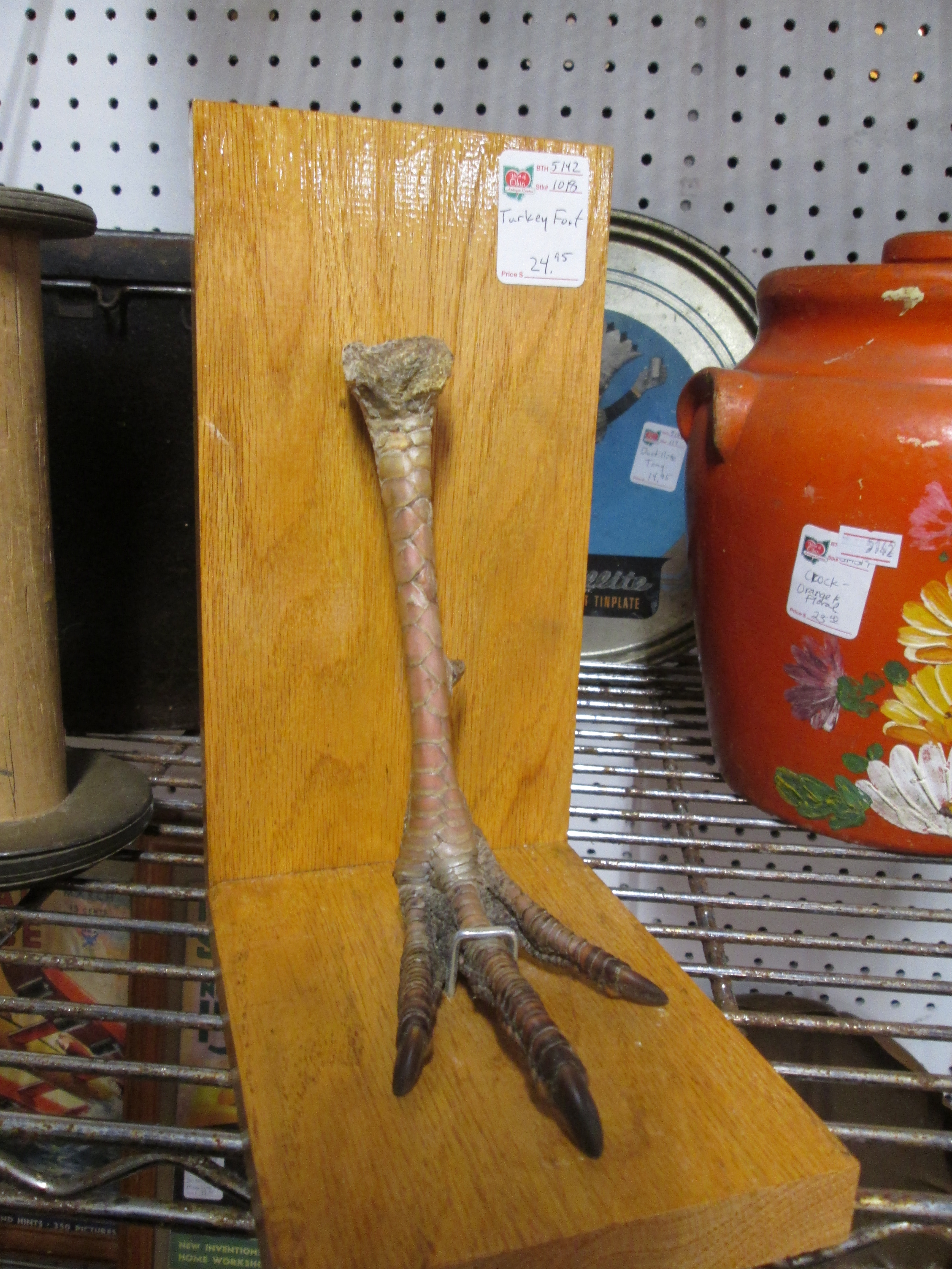 Next morning we headed to Ohio; the drive was uneventful and we made it without mishap to Springfield, the home of the Heart of Ohio Antique Mall. The mall is so big that it took us three hours to do a quick browse through. We saw many wondrous things including this mounted turkey’s foot. There’s a story behind that one — perhaps involving voodoo?