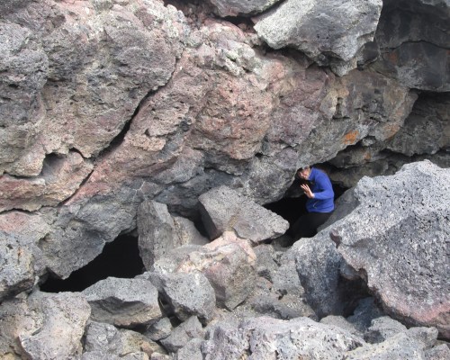 Funky formations included lava fields littered with caves (here Nicole descends into the netherworld),