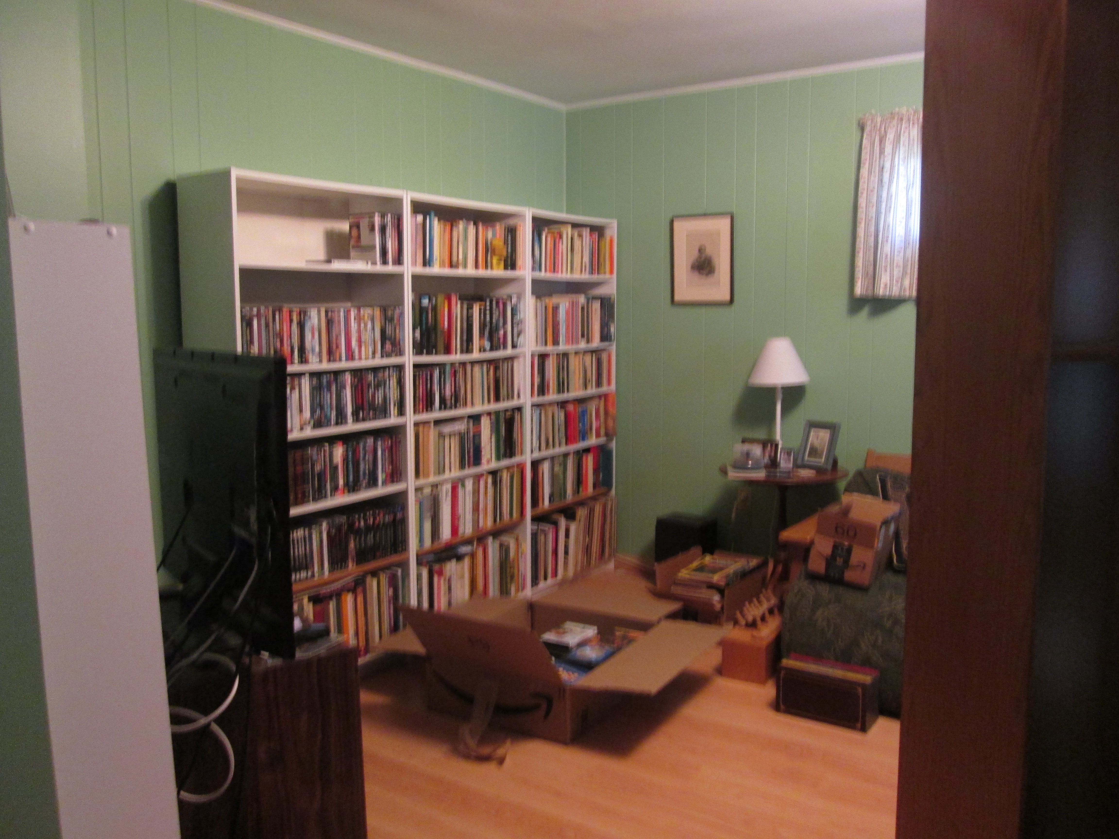 After we wrestled the shelves into the family room, the rest was up to me. I got busy moving books.