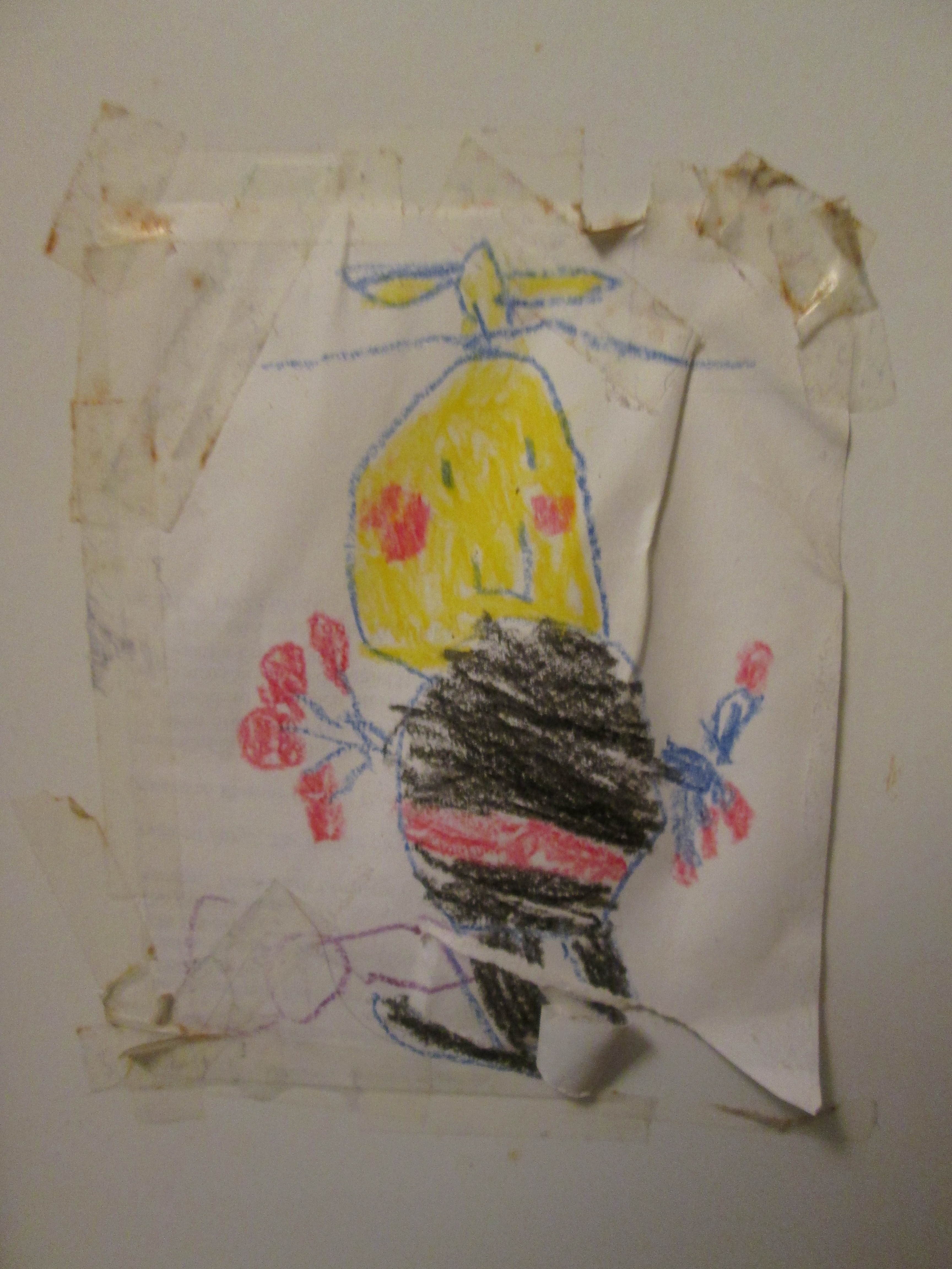 I’m not sure which of my children drew it, but I’m going to leave it where it is.Β If that makes me a sentimental fool, well, so be it. I’d rather be surrounded by memories than living in a context-free, meaningless present. Remember what Shirley Jackson said about reality: “No live organism can continue for long to exist sanely under conditions of absolute reality; even larks and Katydids are supposed, by some, to dream.” Words to ponder.