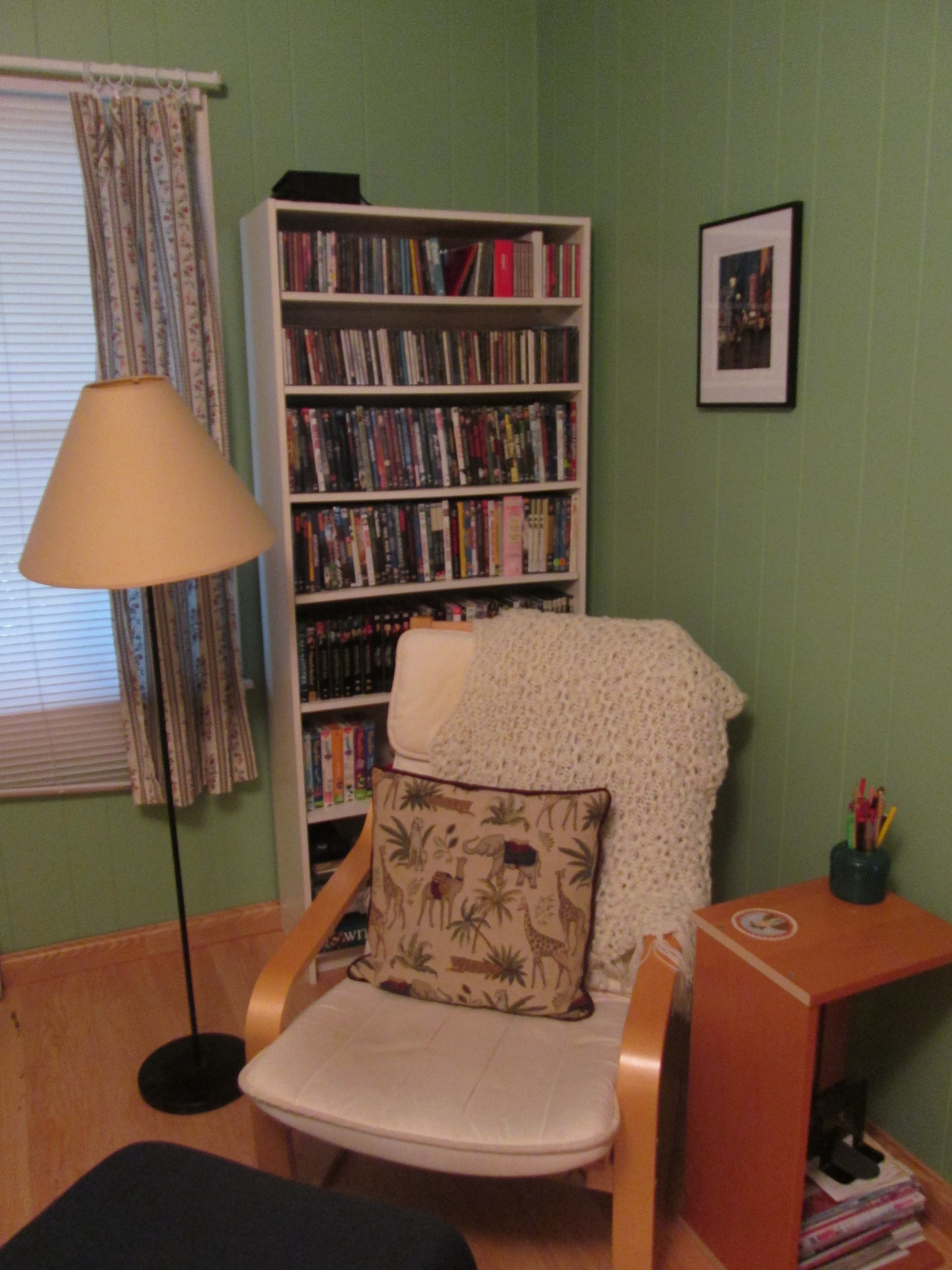 Note the new pillow — I picked up two of them in Idaho. The Ikea chair is on its last legs, but it’ll do for now.