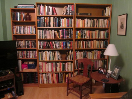I spent the week moving books. On Monday the DH and I rented a UHAUL van so that we could move home three large, heavy, wooden bookshelves that I bought from a retiring colleague. It was a harder job than I anticipated and getting them from the second floor office to the van was a major pain, but with the help of a couple of colleagues and a kind, brawny passerby we managed. At home we did all the hefting ourselves. These shelves are big and extremely heavy!