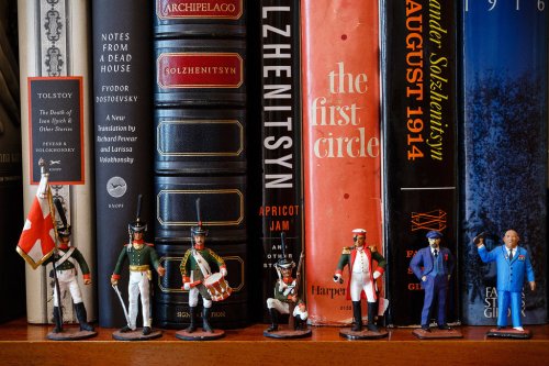 and putting the plot in its historical context. Much to the surprise of many in his very large audience of (mostly) wealthy, gray-haired-female-book-club-members, he told some hard truths about the Soviet’s brand of communism. To keep the mood light, he tempered those comments with hilarious stories. It was a truly delightful evening. By the time I got to my hotel (no way I was going to drive 2.5 hours home in the dark), I found that I was way too tired to grade as I had planned. I fell to sleep immediately and slept like a log. The return trip home was uneventful, and although it had put me even further behind than had last week’s out of town guest, it was well worth it! I mean, anyone who has a bookshelf like this in his study is my kind of guy (and I’m not referring to the figures’ nationality but to their presence there at all).