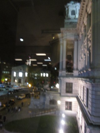 I’m afraid I’ve been shelling my days lately, and it’s only when I take a breather from the task at hand that I look around with amazement at the world — usually to remember it’s there at all. Amor Towles, who wrote the title sentiment, definitely falls into the latter category. Earlier this week I played hooky from work (shh, don’t tell) and drove down to Syracuse so that #1 son James and I could attend an author-event featuring Mr. Towles. The drive down went very smoothly: no dashboard lights threatened; the weather was clear and crisp, and the GPS spoke right on cue. James and I did a little shopping and then enjoyed dinner at a local watering hole, the name of which escapes me. I was having too much fun all evening to remember such details, and of course ALL of the photos I took were as blurry as this view of downtown Syracuse that I shot through a window on the second floor of the Crouse Hinds Theater.