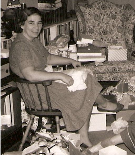 As I prepared to write this post and looked for an appropriate photo of our mother, I realized that I do not have many. Back in ‘our day’, photos belonged to special occasions; we could not record every moment of our daily lives, and the fact that our mother usually acted as photographer reduced her appearance in photos even more. She did not like to have her picture taken. Here’s a cropped photo from a Christmas in the early 1960s.