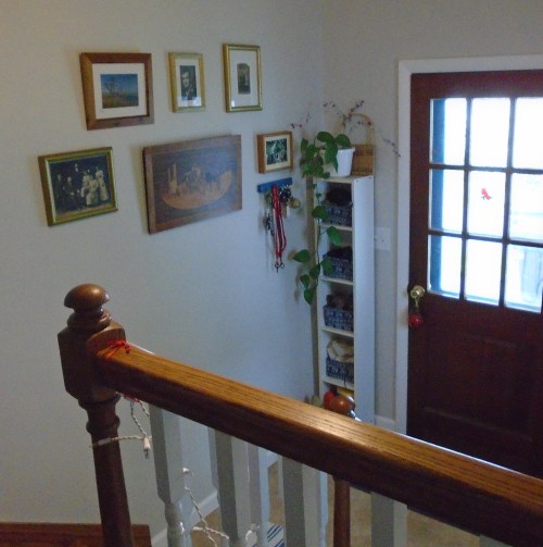 Honestly, they aren’t so badly arranged as they look in the photo, nor are they too high on the wall. It’s an awkward space to photograph.