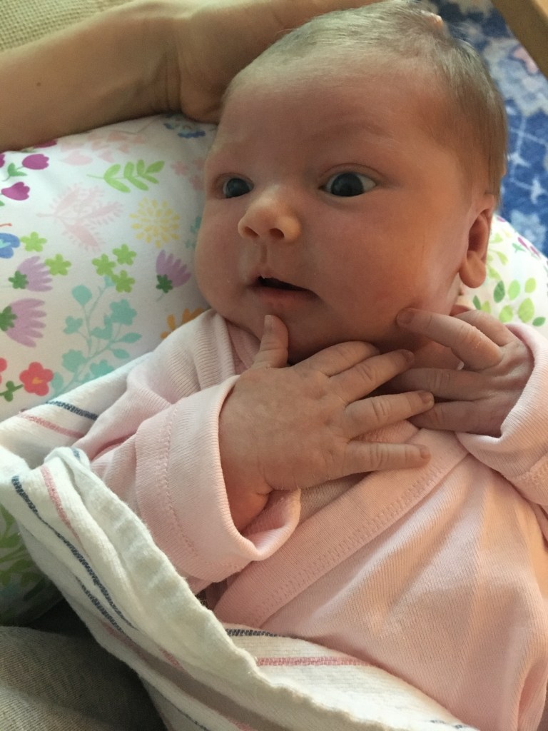 Two weeks feels like a huge milestone for these first-time parents. She has gained precisely the right amount of weight (now 9 lbs 5 oz!) and is off the charts for height. (The doctor says, “She’ll definitely be taller than 5 foot 4!” OK.) I feel affirmed that I have been successfully feeding her, given how unknowable it all felt in the beginning. But as everyone has told us, it probably isn’t all the advice books and frantic Googling that makes good parenting — just loving her and doing our best.