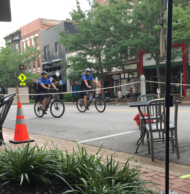 How was your 4th of July? The OM and I had a super fun time visiting daughter #1 in mid-MO. We got to eat outside and people-watch for awhile on Friday night. Schmidt and Jenko were patrolling downtown Jeff City…