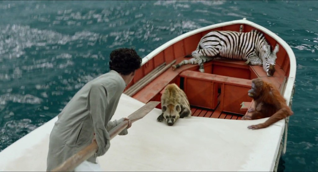 2. The Life of Pi (2012). A boy, an orangutan, a zebra, a hyena, and a tiger get stuck on a life boat together.