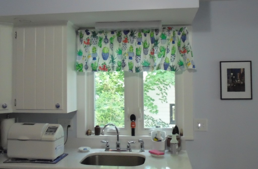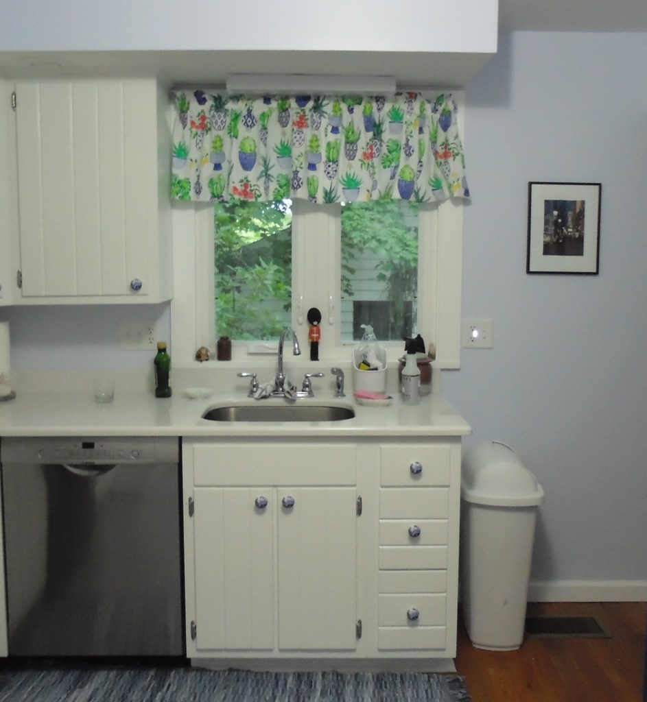 While painting and carpeting were going on, yours truly got her trusty sewing machine down from the attic to make the kitchen valance. I haven’t sewn anything since Halloween costume-making days (probably 20 years ago) and even then I wasn’t very good at it. However, I persevered and voila!