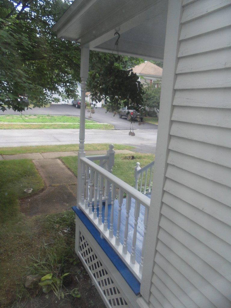 Yesterday, right on schedule the porch painter and his helper showed up and got to work. It’s a tiny porch so it didn’t take them long. The paint color is a wildly bright blue — brighter than intended — but at least the porch looks better.
