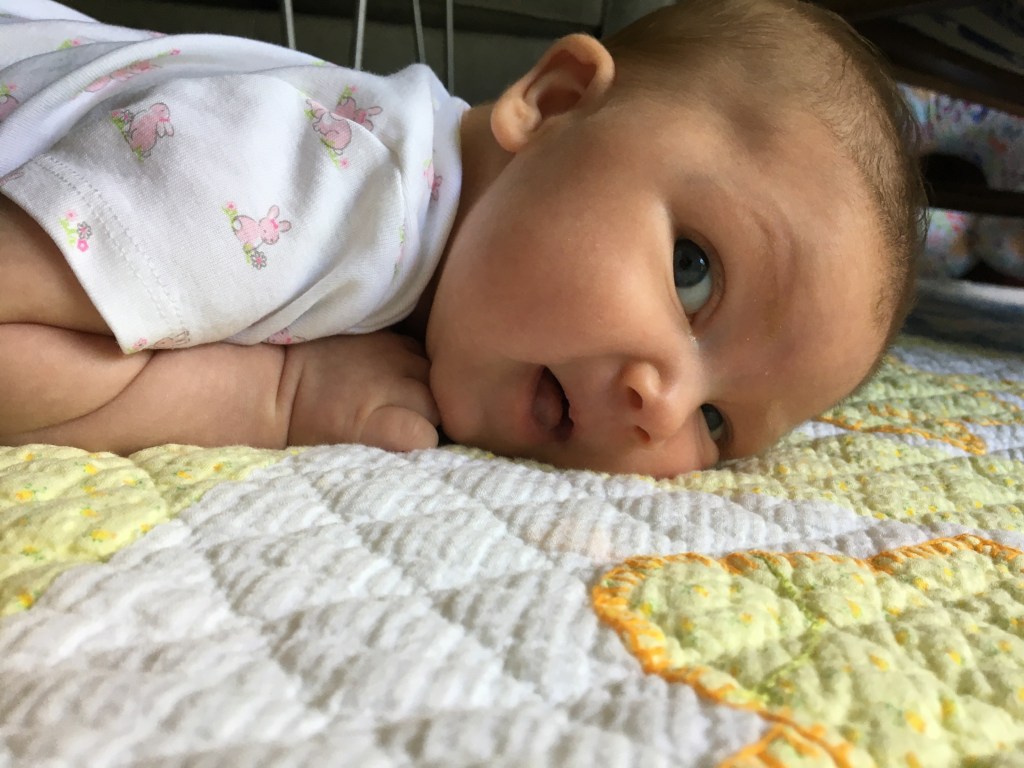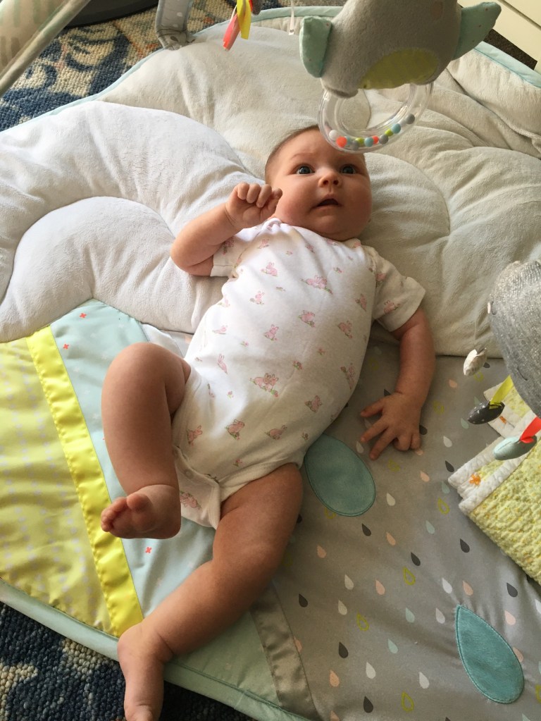 She is getting lots of exercise on the play mat and brief stints of tummy time when she can bear it. Next week she will have her 2-month pediatrician appointment, and we’ll be able to report back with her new “stats.” In my mind, she’s bigger just about every time I pick her up!
