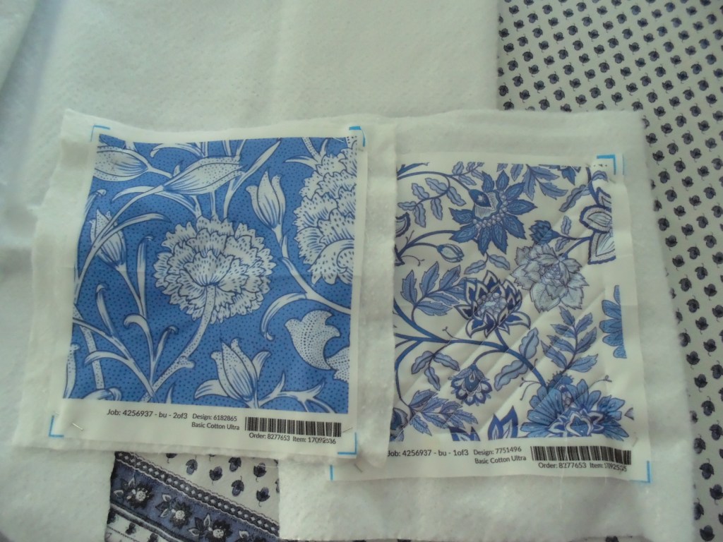 I also purchased a small cutting mat, regular cotton batting and special heat-resistant batting called Insulbrite. Then I cut the batting to go with the sample pieces and started quilting. I’ve done about half of the right piece in the photo below. The lines are supposed to be evenly spaced and straight, but who cares? It’s my first potholder.