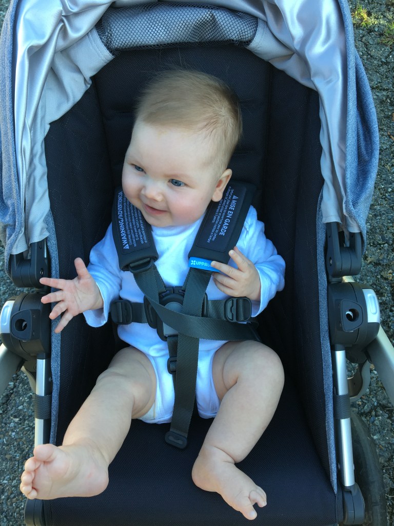 The little babe does continue to grow bigger and bigger, and even graduated to the actual stroller seat (as opposed to the car seat, which can click into the stroller). She was thrilled to have the wiggle room and improved view of her parents and surroundings. (No way am I ready for her to face out yet!)