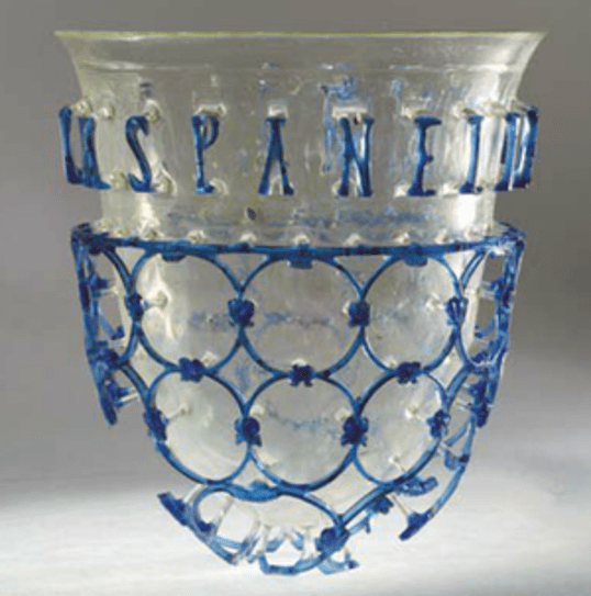 By the late Roman Empire, in the 4th and 5th centuries AD glassmaking had reached its apogee; the cage-cup (diatretum) represents the extremes to which glassmakers would go for their art. Here’s a 4th century AD example from the Heritage museum Pljevja, Montenegro.