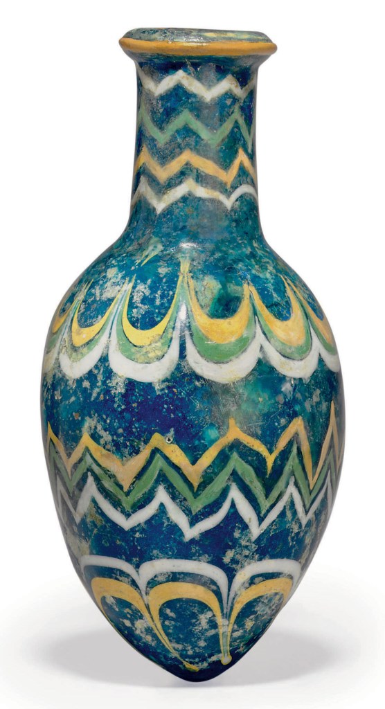 One of the real joys of life is learning new things. This week I learned all about ancient glassmaking and was amazed to discover some of the wonderful objects that have survived. Glassmaking didn’t really take off until the 1st century BC when some smart bloke invented the art of glassblowing. Until then they made pretty, but rather clunky, glass bottles by working them around a clay/dung core and then scraping out the core afterward. Core-formed glasswork is believed to have developed in the Near East sometime around the 16th century BC. Here’s an example of core-formed glass from Syria.