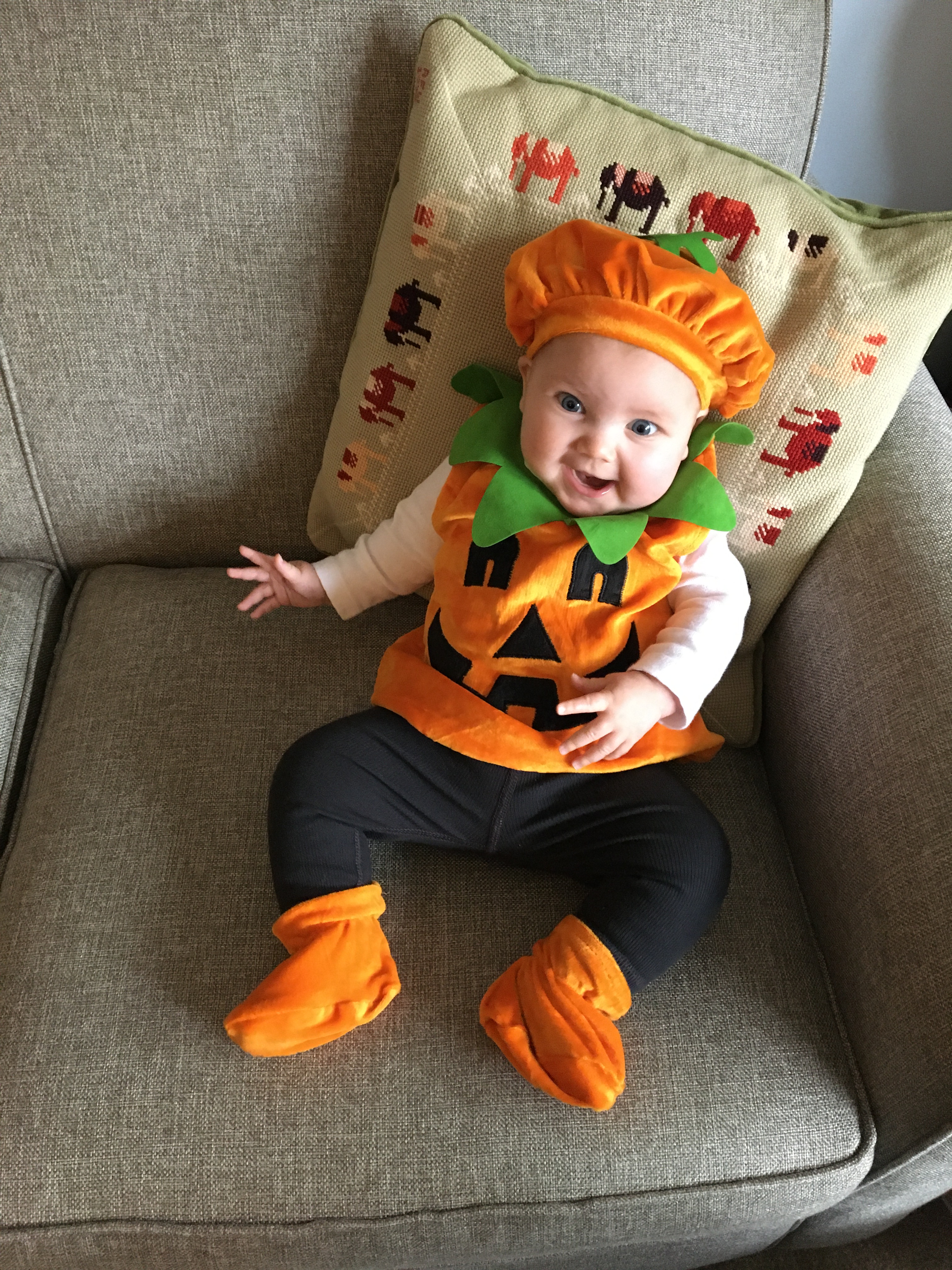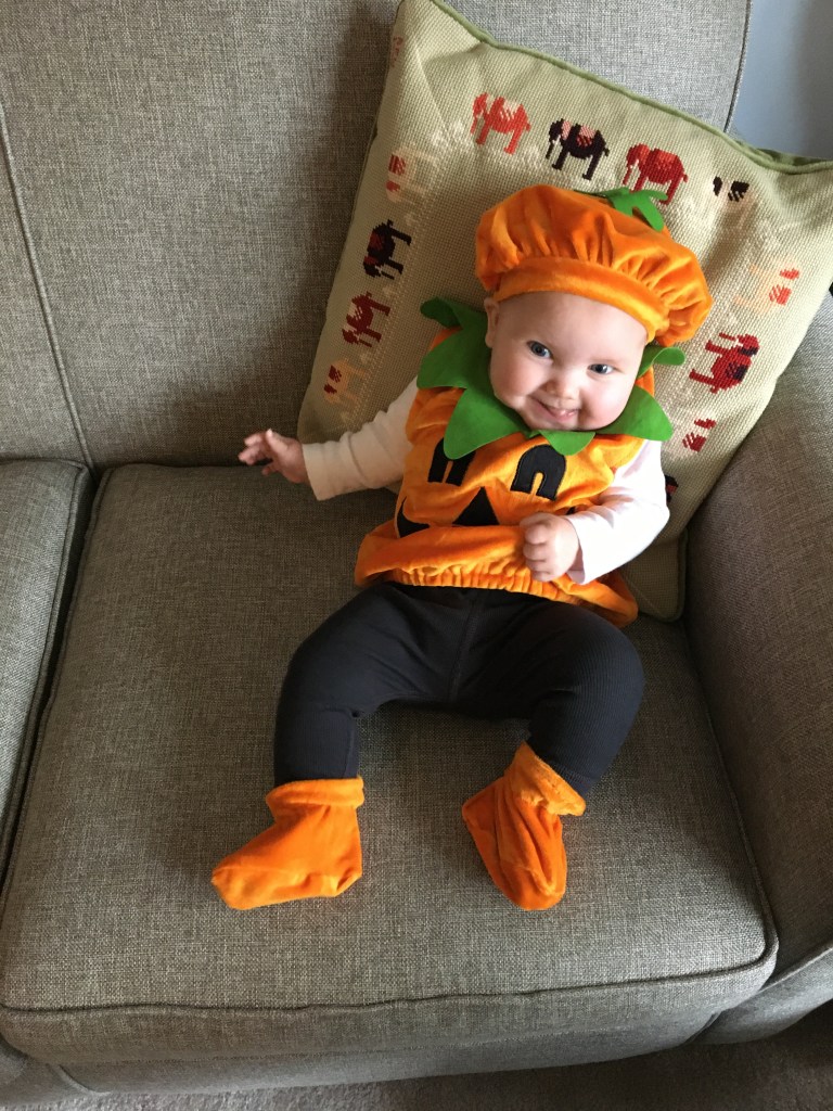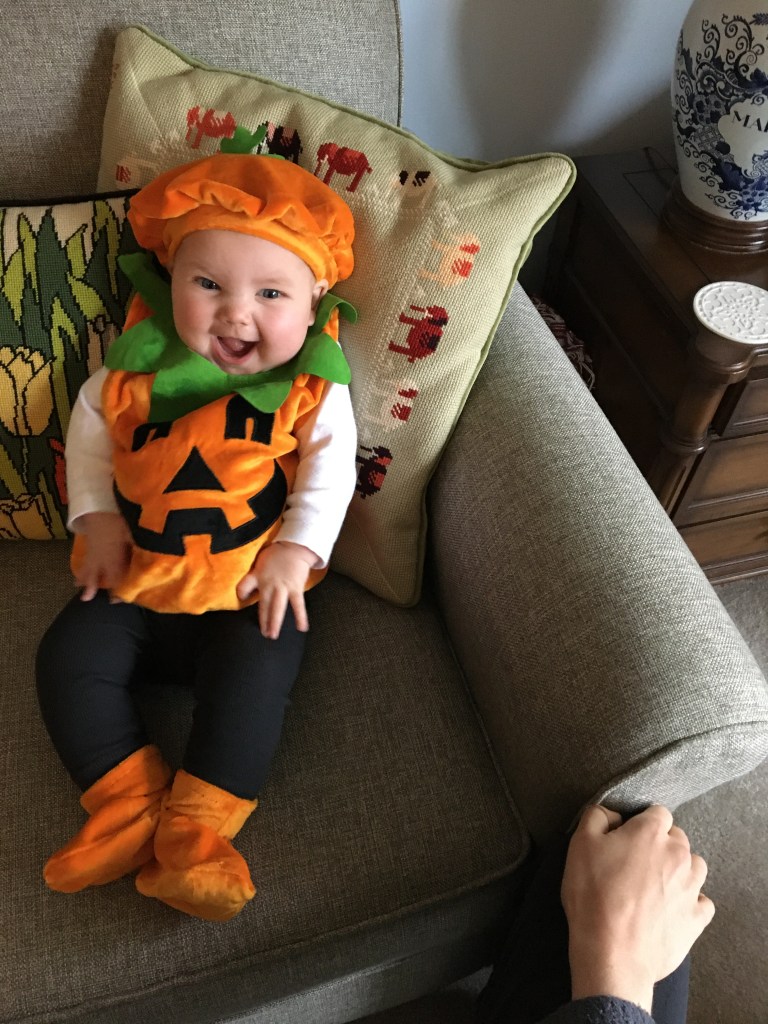 I have never been a huge Halloween person and have been pretty disturbed by the degree to which my neighbors have gone overboard with decorations this year. I guess everyone is in need of some catharsis? But I could do without faux graveyards on every corner. That said, I felt a real intense need to get my darling daughter into a pumpkin costume this month and I have no shame.