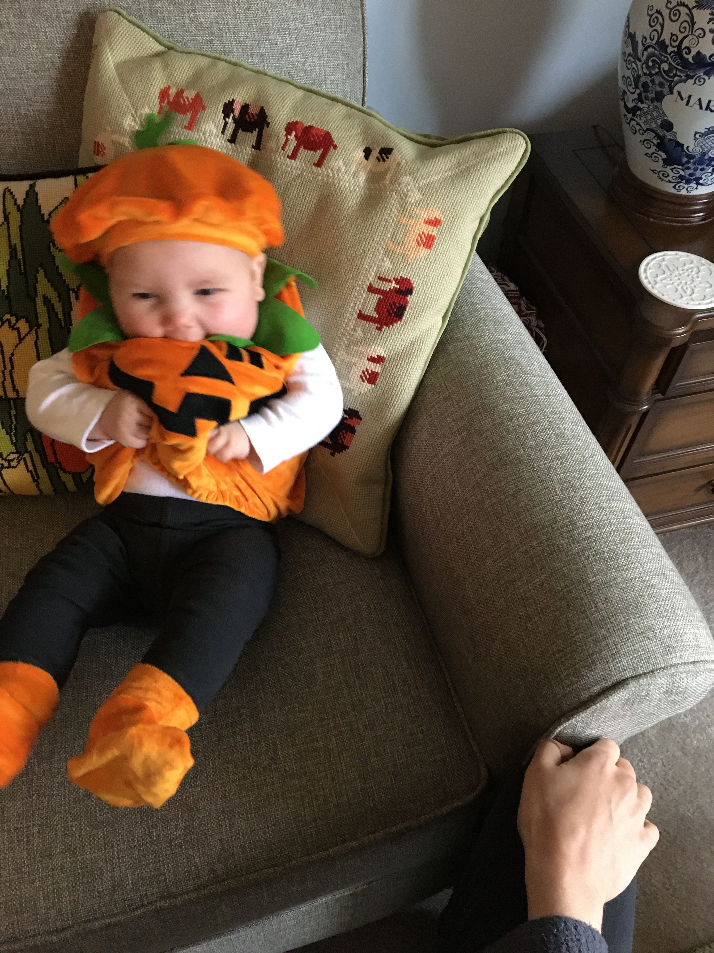 The pumpkin beret! The booties! Her little tongue! She was feeling this costume.