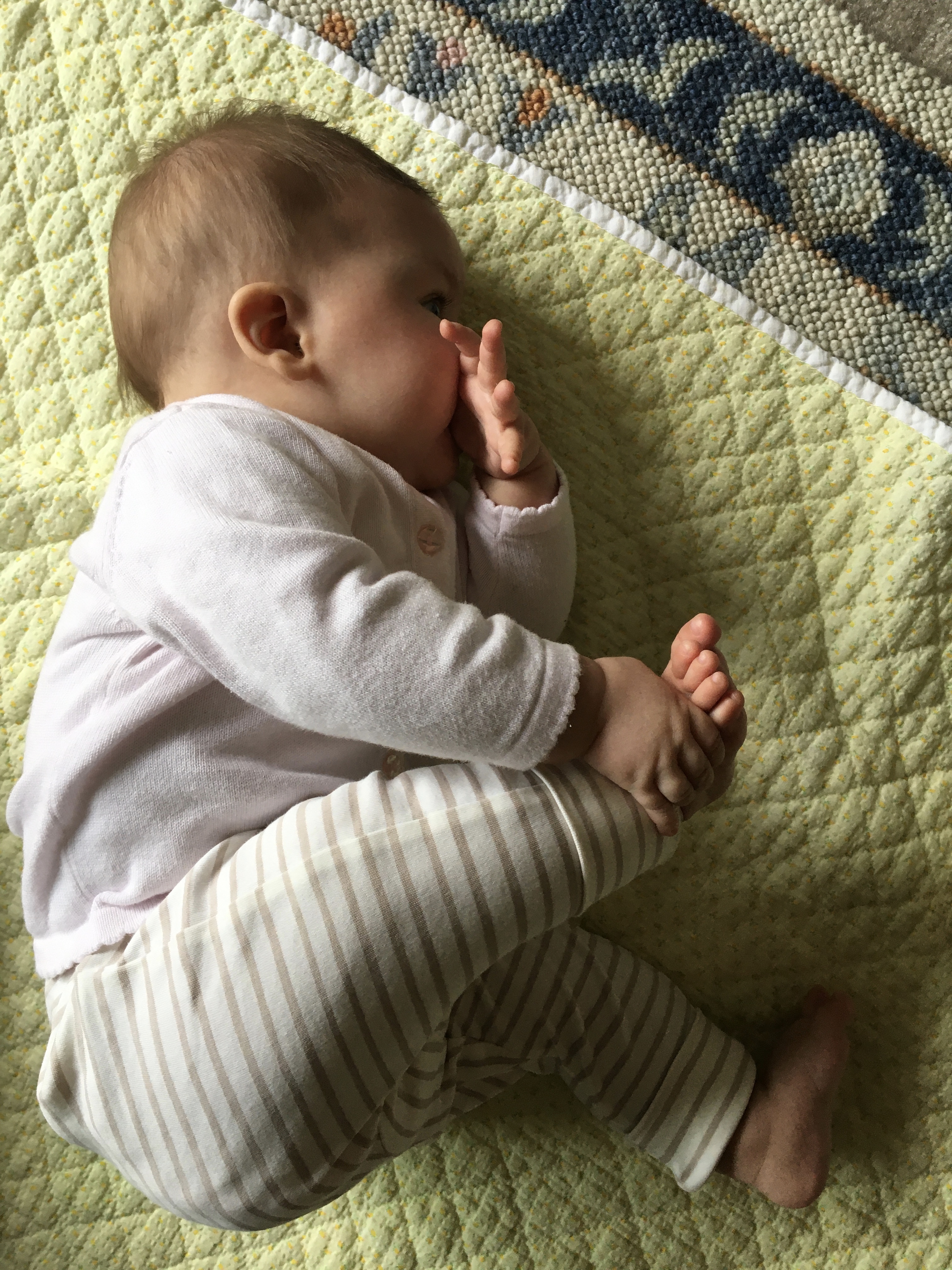 The babe continues to be the sweetest “pumpkin” around. She continues to love her feet. Her thumb has also grown in her estimation. Sometimes she manages to suck her thumb and grasp her foot simultaneously — a double whammy of comfort.