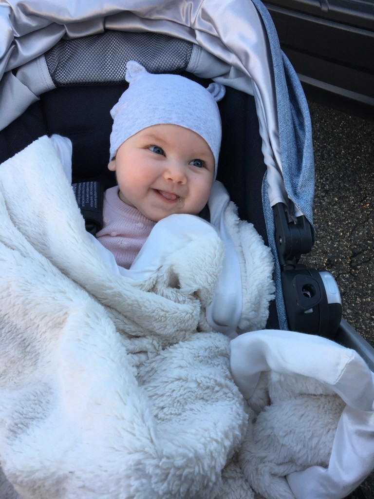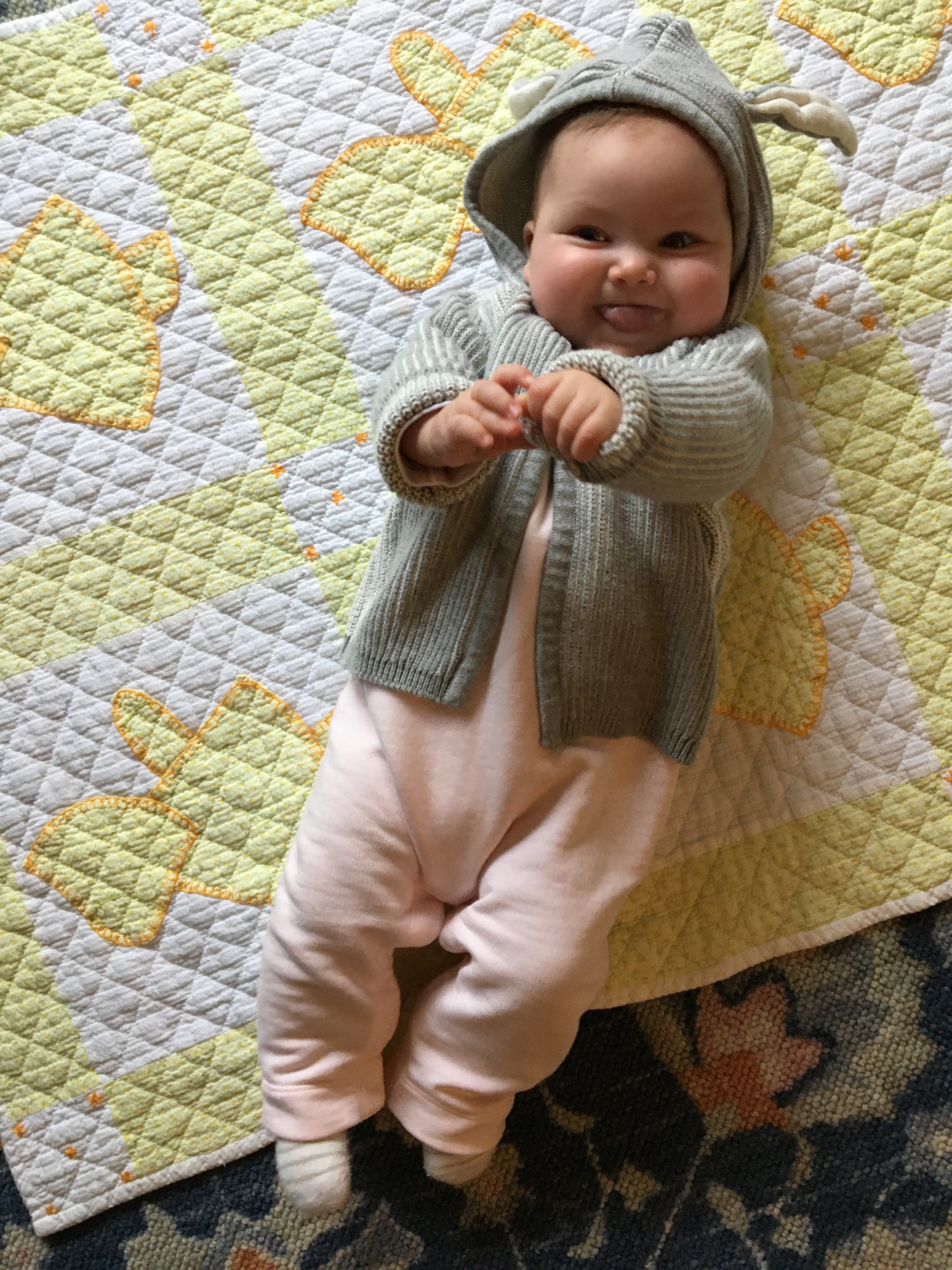 Well this is a very darling age of sticking our tongues out, shrieking with joy, holding on to mommy’s arm while sitting on her hip, and so on. Add to that a winter wardrobe with ears attached to everything and it’s all pretty darn cute.