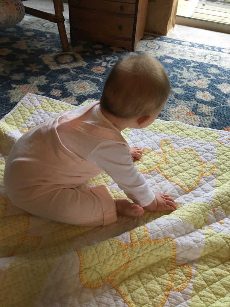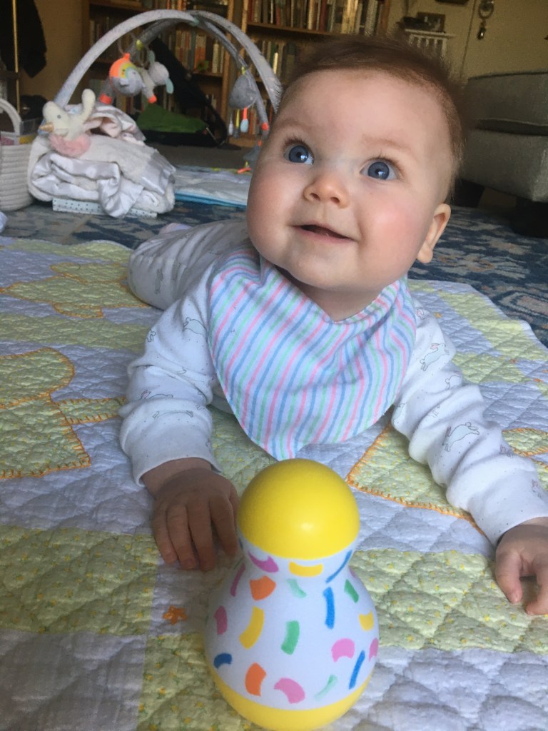 Occasionally, we practice sitting up (albeit pitched forward) and do very much enjoy this view of the world. As for rolling over, we’re still working on it. We’ll get there!