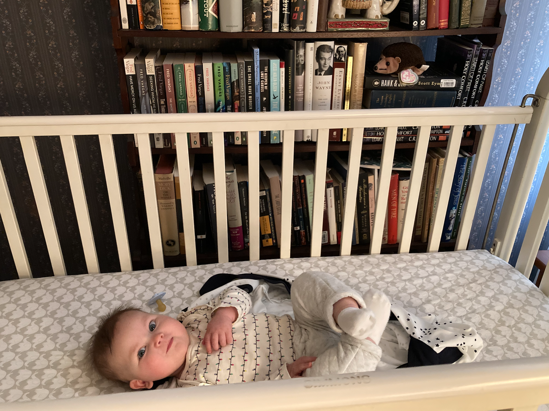 …in her upgraded, full-size crib that is adjacent to quite the book collection. I like that she is eye-level with Emerson, Hawthorne, and all of my other favorites. (And directly above her is John Wayne!)