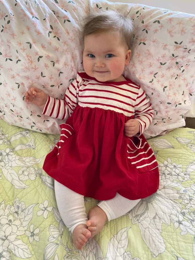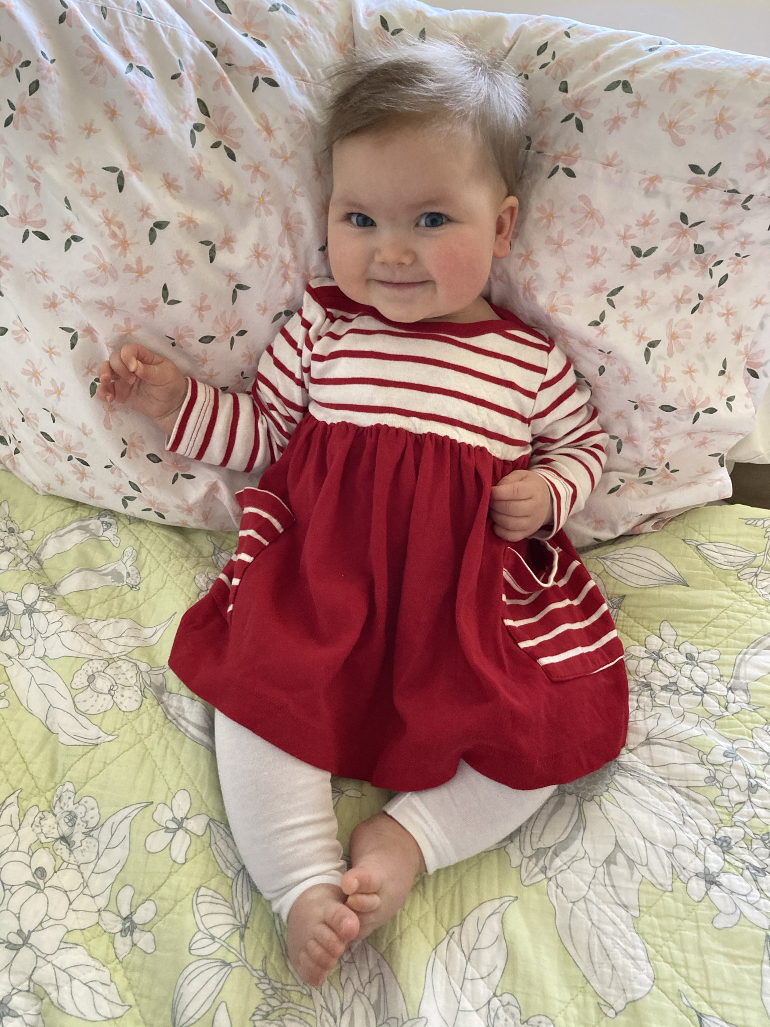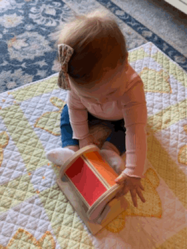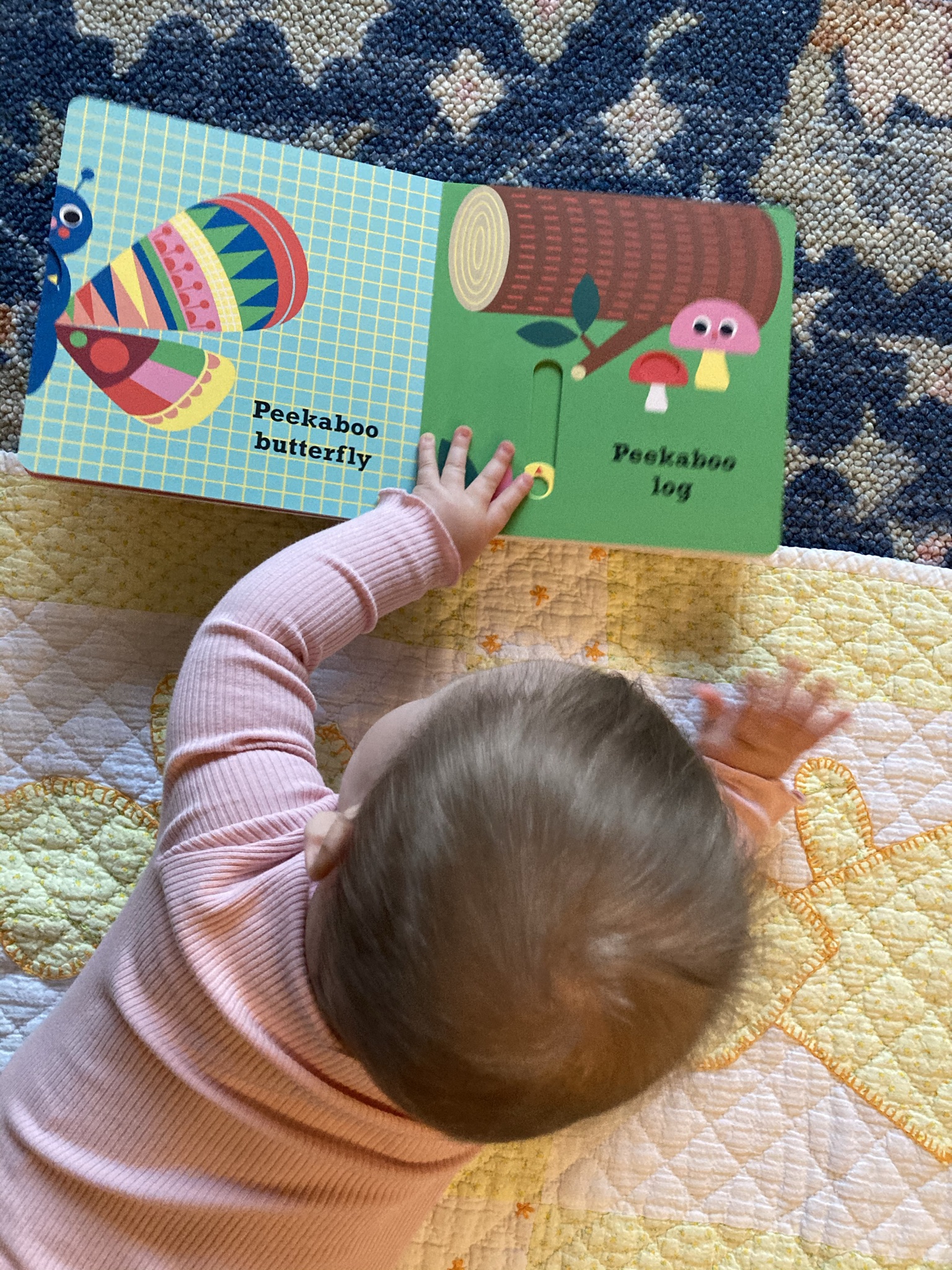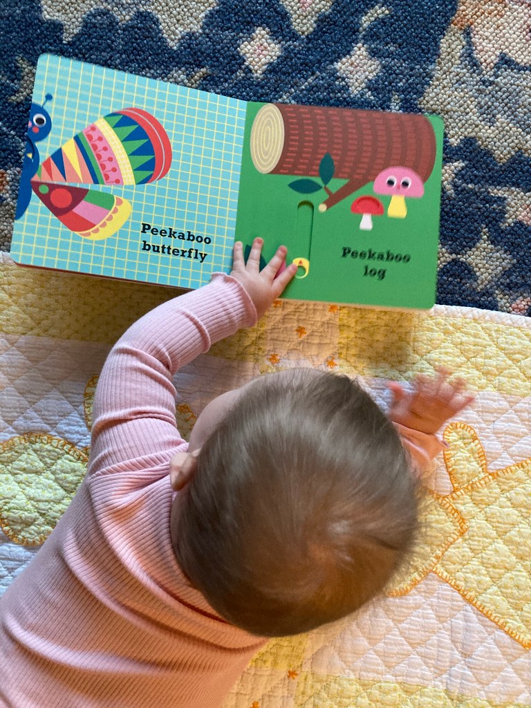 Rest assured, we still love tummy time, though we don’t stay on our tummies too long before we start rolling around like a nut ball. Katie has also become very interactive with books, though properly turning pages is often an accidental byproduct of trying to shove the whole thing in her mouth. (Literal) baby steps.