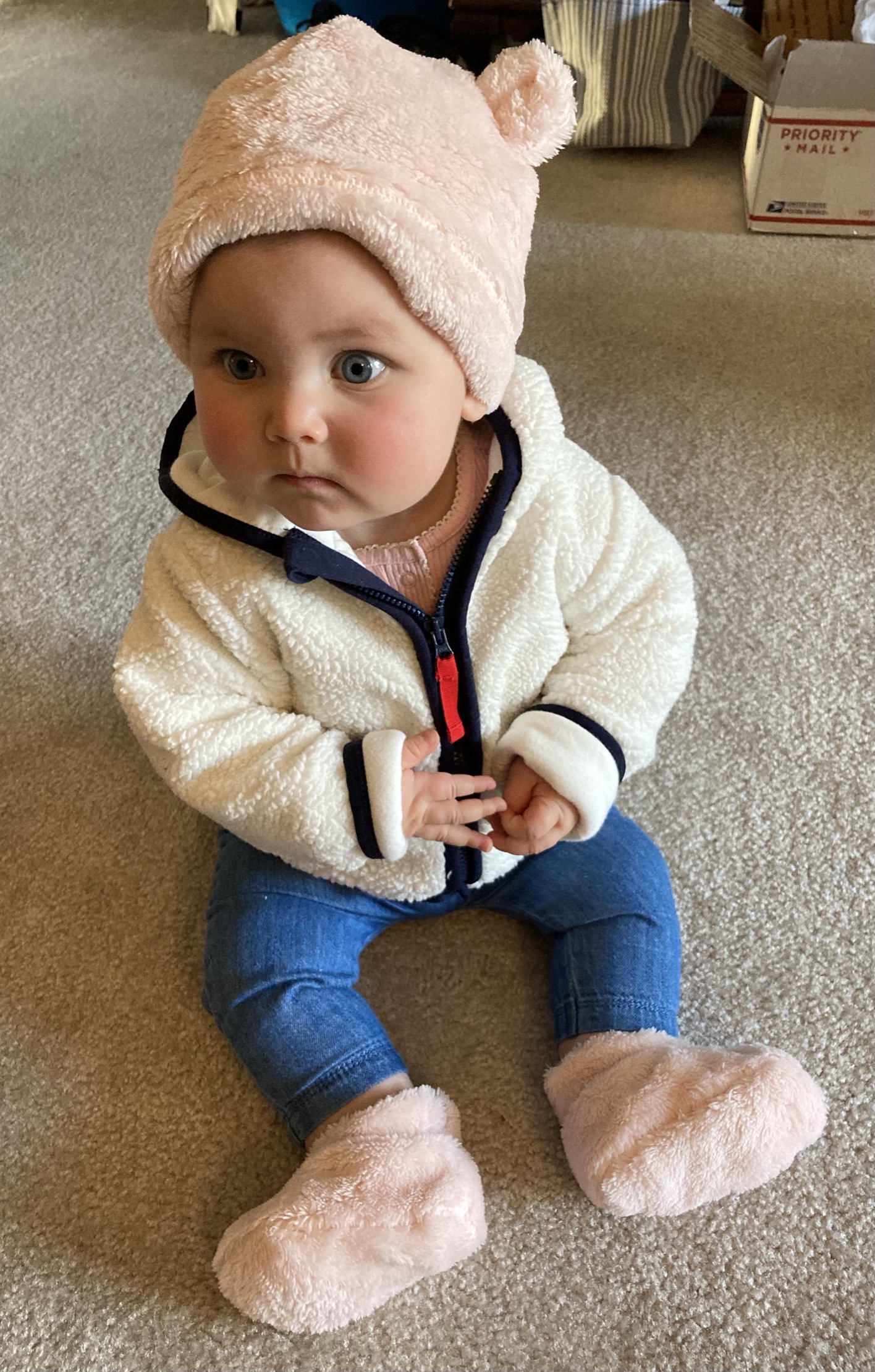 Katie sporting a new hat and booties from her Aunt Mary, fresh from a care package. “Priority Mail” (see background) might be an oxymoron these days, but it is the case that we are now receiving all of the retail therapy orders we placed as the holidays concluded. (My order included the chambray pants Katie has on.) Is Katie the beneficiary, or are we?!