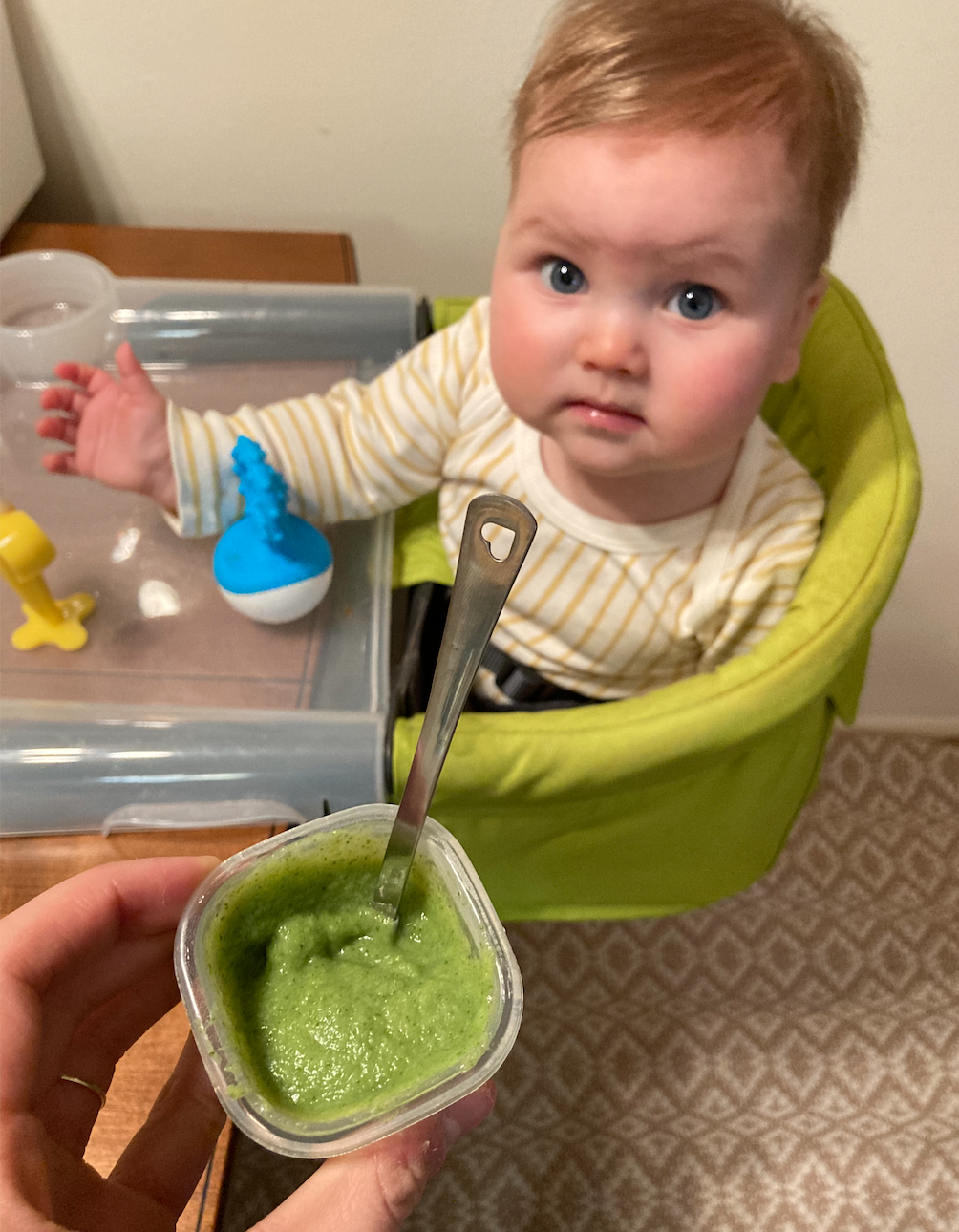 Clearly, she wasn’t sure how that would go, but she’s been devouring the bright green purée for several days in a row now, so she must take after her father in her taste for cruciferous vegetables. More power to you, honey!