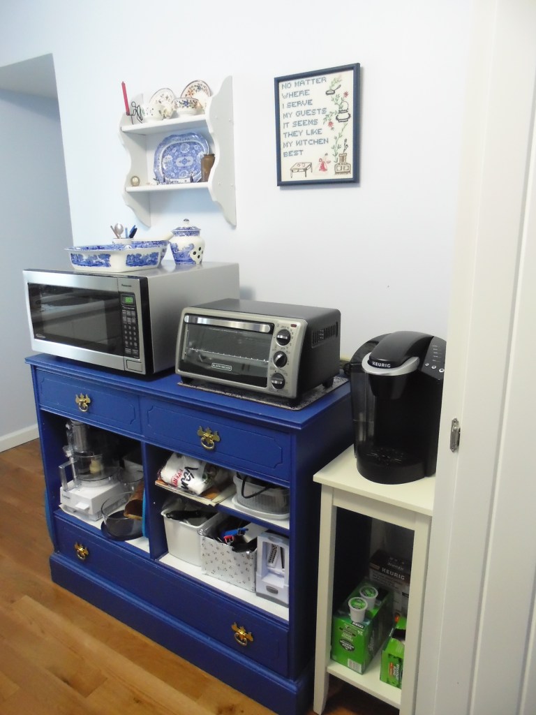 The DH and I recently used a couple of Amazon gift cards we received at Christmas to purchase a new toaster oven and a Keurig. Since there was no counter space for the Keurig in our little kitchen, we had to purchase a tiny little table for it and rearrange the appliances accordingly (the microwave moved left). I think it all worked out pretty well — it’s certainly a functional arrangement — although I do wish I could fit the doors back on the sideboard.