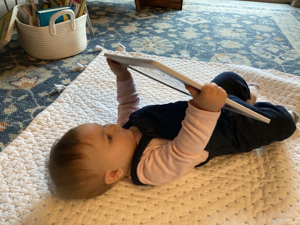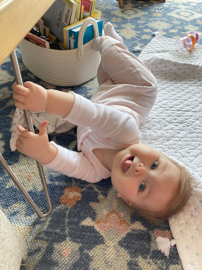 Katie dear has been just the sweetest this week, smiling lots and snuggling in for pseudo-hugs. She is rapidly advancing toward mobility, and everyone keeps warning us that it’s “game over” then. I don’t think I will resent my daughter for crawling, but whatever. For now, she wriggles and wiggles and rolls around plenty. She seems genuinely delighted by playing with her toys, looking in the mirror, and turning her head upside down.