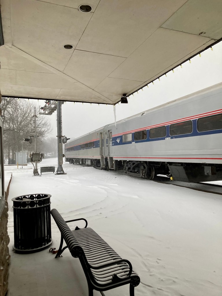 I was a little worried that I’d end up stuck in a snowdrift on the train for hours but thankfully that didn’t happen–only an hour delay in the station. The train was only 25% full and very pleasant. It occurred to me that I had not taken the train from Kirkwood Station since 10th grade when we rode the train to a journalism conference in Kansas City! Twenty + years ago!