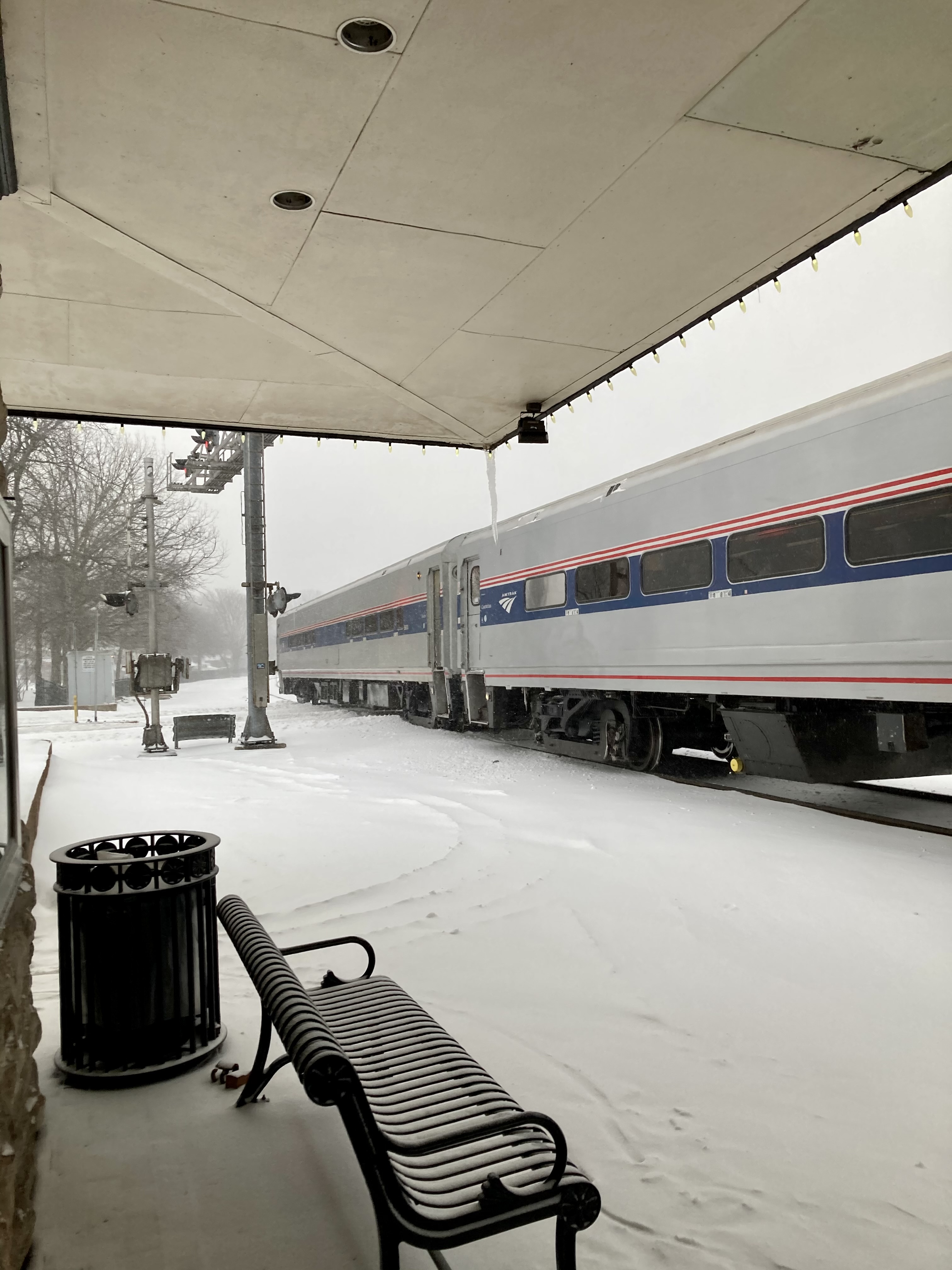 I made it to the Jefferson City train station and had packed lightly to ease my walk home. However, the snow drifts were high and the sidewalks unshovelled. Luckily, a nice older couple offered me a ride in their giant pick up (it was only two blocks). They had just dropped their daughter off on her way to Kansas City because she had gotten stuck at home too. As state employees, we had all gotten the news that our respective offices were closed the next day because OF COURSE.