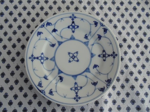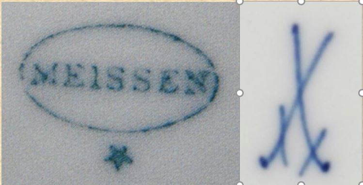 It’s quite a mish mosh, but as I said, I have had a lot of fun researching. For example, the cake stand is Copeland Delphi Grey (i.e. Spode) from about 1850-1860 — assuming it’s real. (You’ll notice there are two stands, but the one at the back on the right has been broken and repaired.) I’m doubtful because the collection includes other copies. The ‘Meissen’ blue onion plates in the top photo were actually made by another German porcelain maker calling itself the Meissen Oven and Porcelain Company. The company produced from 1882-1929. The mark gives it away; the one on the left in the picture below is the fake, while the crossed sabers mark on the right is authentic. Buyer beware! Sellers on Ebay and Etsy will simply claim ‘Meissen’ — after all, that’s what the mark says, right?