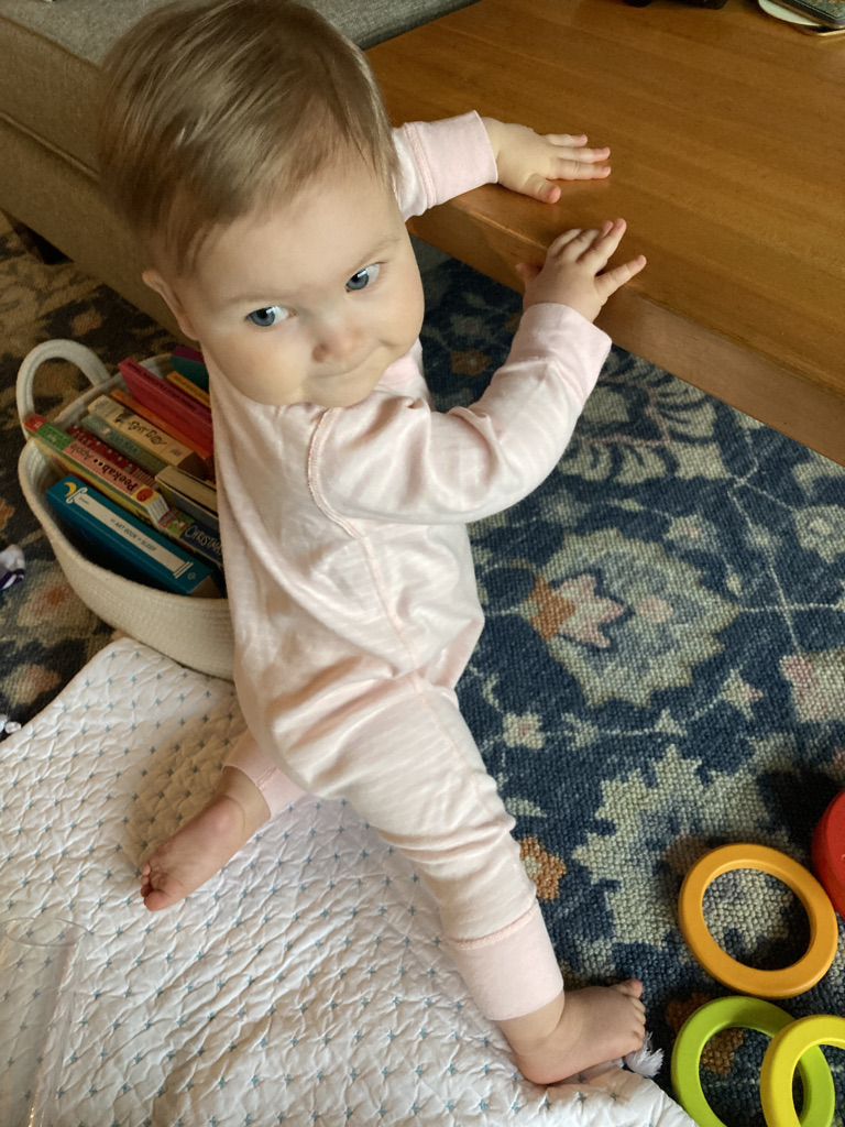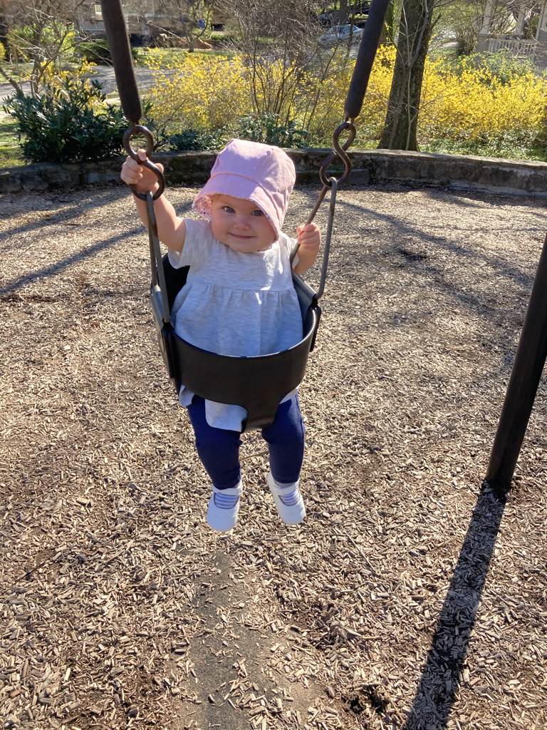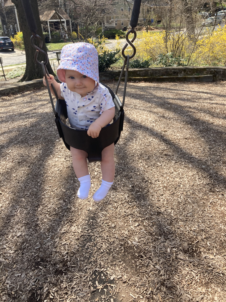 In addition to keeping very good balance in a bucket seat while swinging through the air, Katie also shows her strength while practicing standing. She is getting quite close to pulling herself up, though for now she mostly just pulls into a little kickstand position.