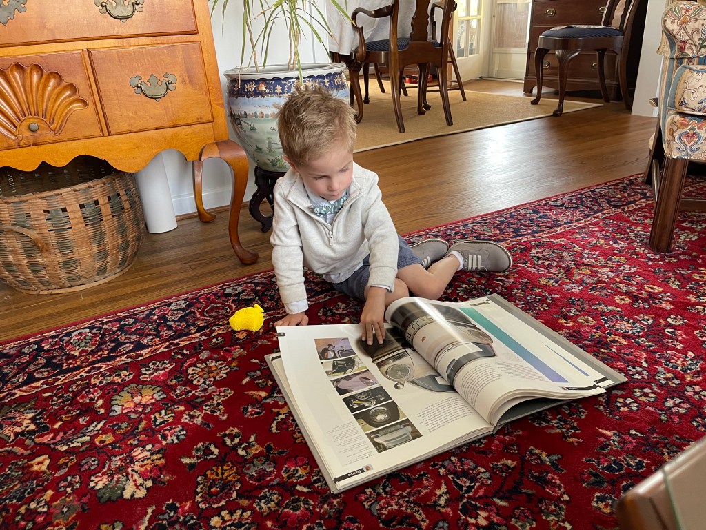 Daughter #1 gave the wee laddie a book on Porsches (estate sale find), which he opened to squeals of joy. He carried it around for the rest of the day.