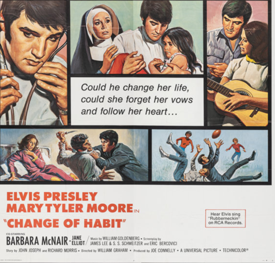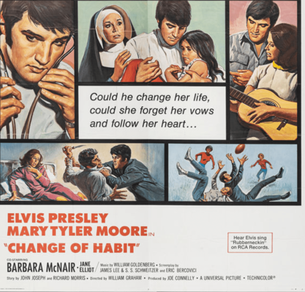 I watched A Change of Habit (1969) the DVD of which daughter #1 had left at our house. You will recall that it is Elvis’s last movie and no wonder. I fell asleep and missed part of it. Oh darn.