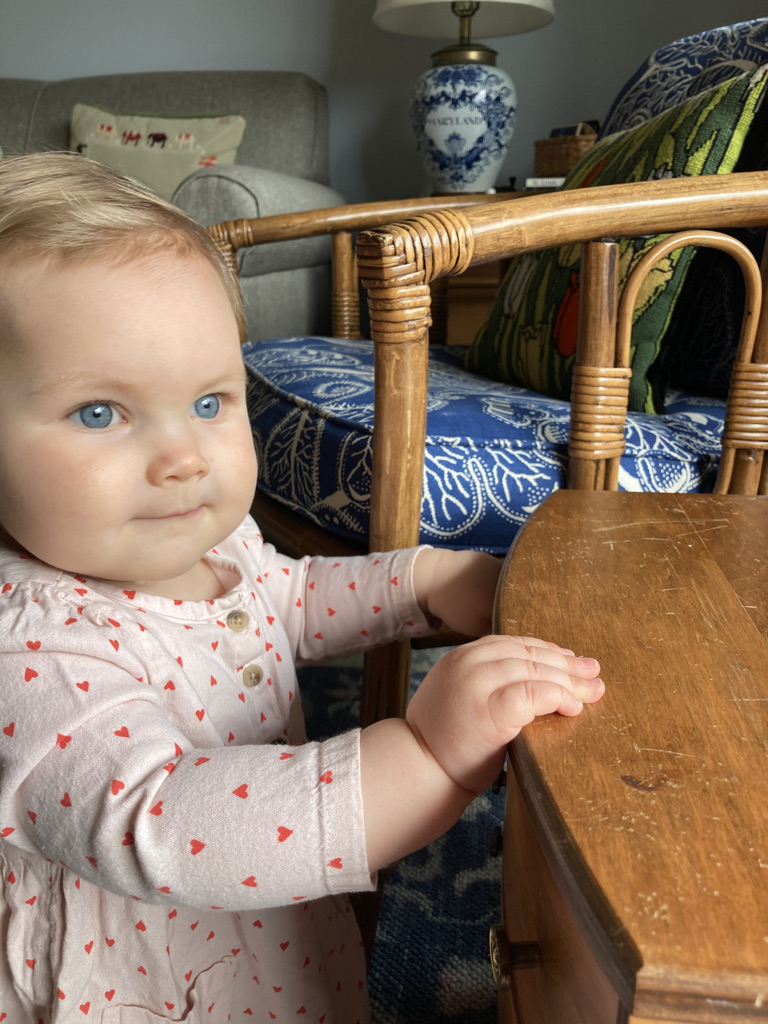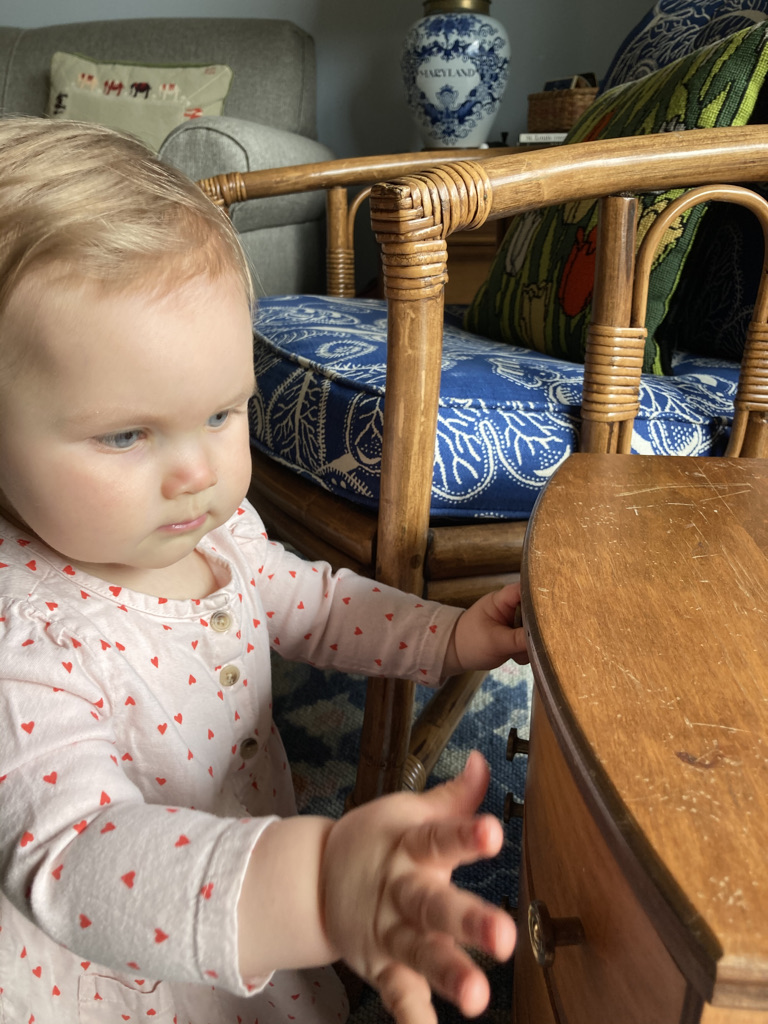 P.S. You might recall that when Katie was very little, she loved to gaze at brown furniture. Well, now she loves to inspect the handles and knobs on all of the brown furniture…