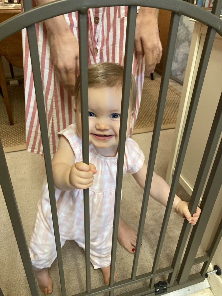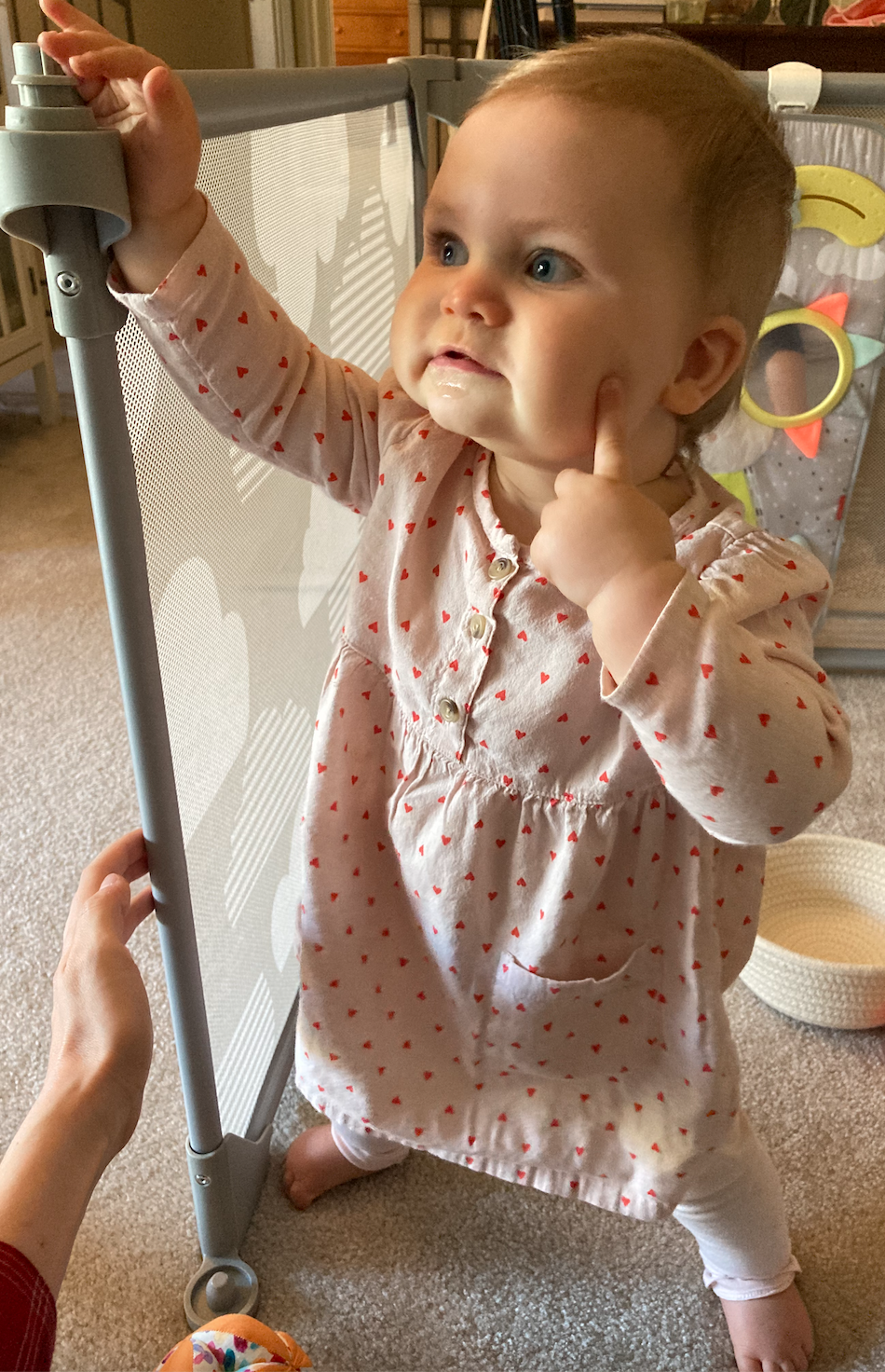 Katie dear now knows how to pull up to standing on her own. Here she is showing off on our newly-installed baby gate at the kitchen. She did this for the first time on a FT with her mamu and aunt, which also consisted of her screaming for, like, 10 straight minutes. This is how I imagine Katie learning a new skill: