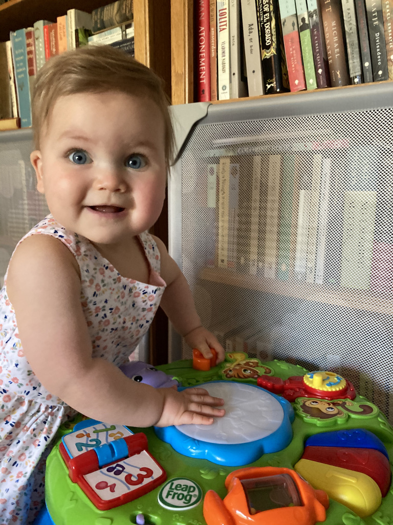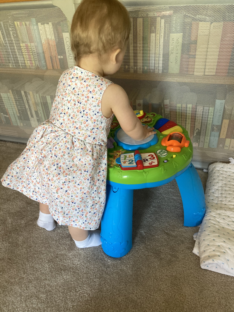 In other news, a friend passed along this standing activity toy for Katie now that she wants to pull up whenever and wherever possible. Did I used to scoff at garish primary-colored toys with jungle themes and music features? Yes. Am I thrilled to now have this in my living room? Yes. Are we still holding firm with the “off” switch on sound? Wholeheartedly yes.